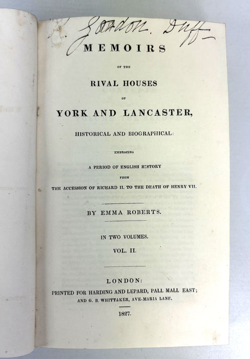 Emma Roberts’ Memoirs of the Rival Houses of York and Lancaster (1827) offers a detailed narrative of late medieval English history, tracing the dynastic and political turmoil from the accession of Richard II to the end of the Wars of the Roses under Henry VII. Combining historical analysis with biographical sketches, Roberts presents a vivid and accessible account of the personalities and events that shaped the Plantagenet and early Tudor periods. This two-volume first edition reflects the growing 19th-century interest in medieval history, monarchy, and national identity, and contributes to the era’s expanding body of historical literature written by women.