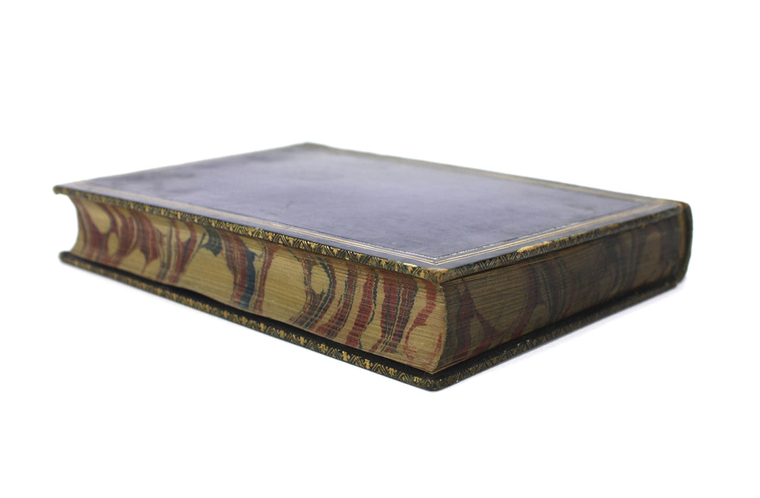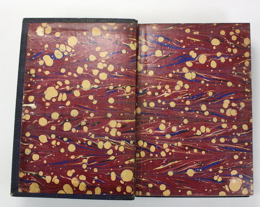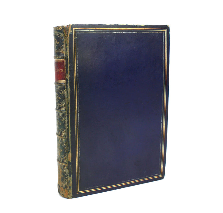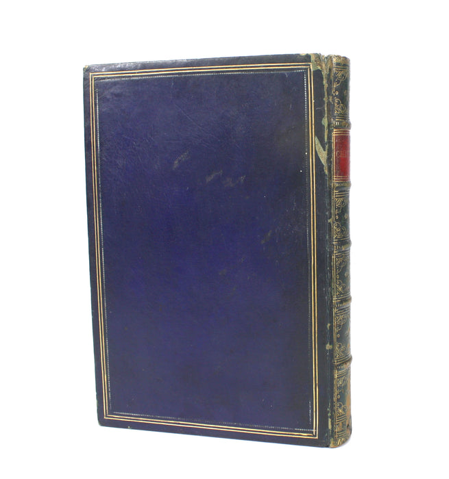 A good dark blue full leather hardback, with raised bands, gilt tooled decoration and red morocco label. Covers worn, scuffed and bumped. Spine colour is faded and the leather is dulled and worn, particularly at the tail of spine. Wear to board edges and outer hinges. Marbled endpapers with marbled text block edges - dust toned to top edge. Some spotting to endpapers.