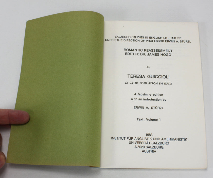 Salzburg Studies in English Literature Under the Direction of Professor Erwin A. Sturzl: Romantic Reassessment editor: Dr. James Hogg; 82; Teresa Guiccioli; La Vie de Lord Byron en Italie; A Facsimile edition with an Introtuction by Erwin A. Sturzl (note: introduction incorrectly printed as "introtuction") - 9 Volume set, complete.