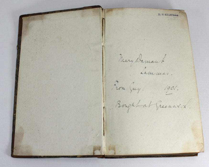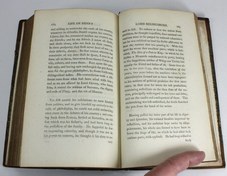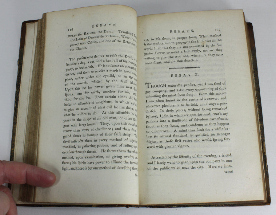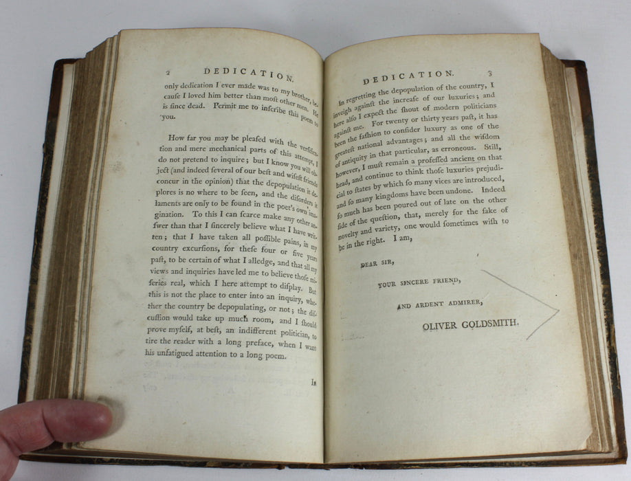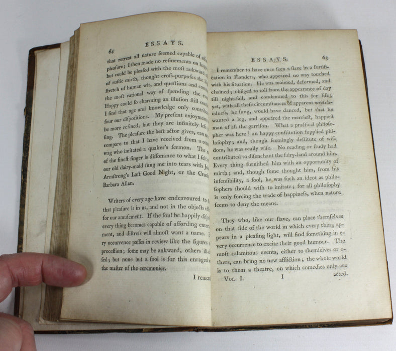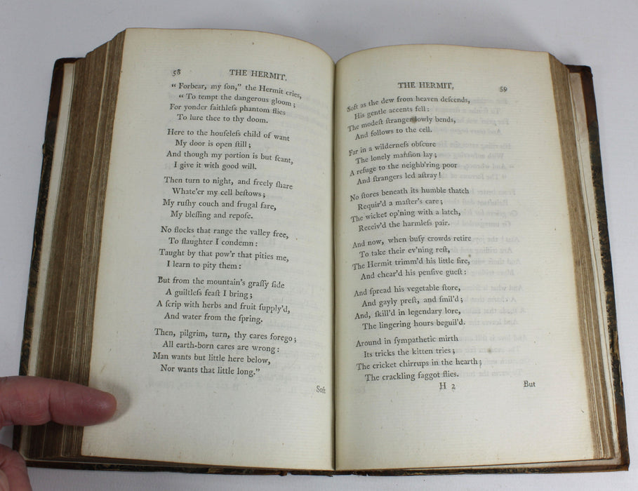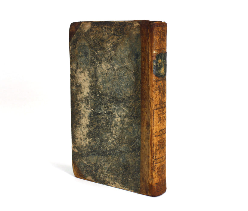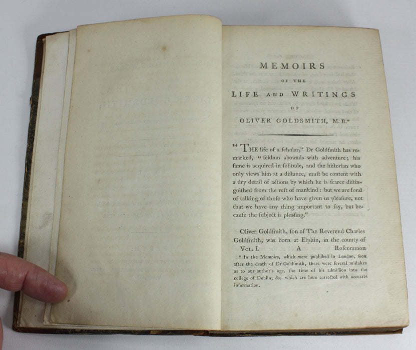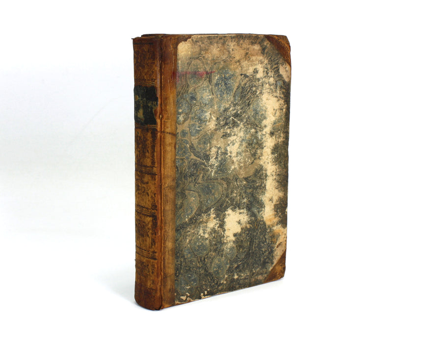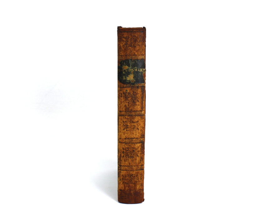 A good hardback with marbled paper over boards and leather to spine and corners. Covers are worn, rubbed and bumped, and the leather is tired. Some splitting to endpapers at front. Previous owners' signature and stamp to first free endpaper and opposite title. Text block is good throughout. Nice and clean with occasional age spotting and a few pencil annotations. Some offsetting to plate - contains one plate opening the Essays of Dr Goldsmith section. Some mild offsetting opposite. Some corner creases.