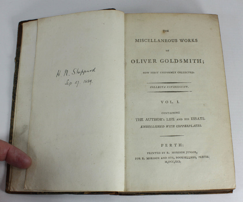 The Miscellaneous Works of Oliver Goldsmith; Now First Uniformly Collected. Collecta Revirescunt. Vol. I. Containing the author's life and his essays, embellished with copperplates. Volumes 1 and 2 bound as one;