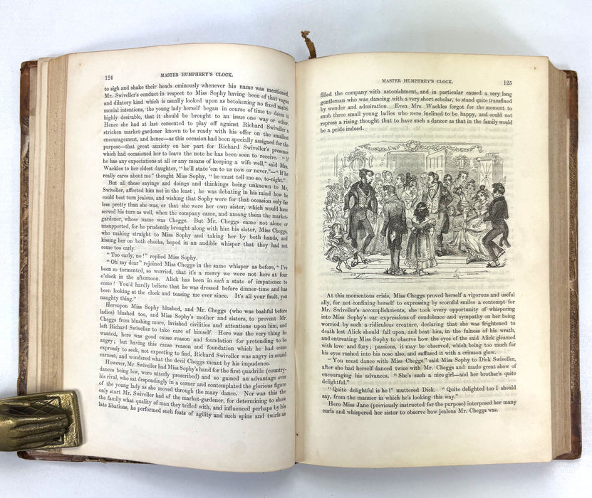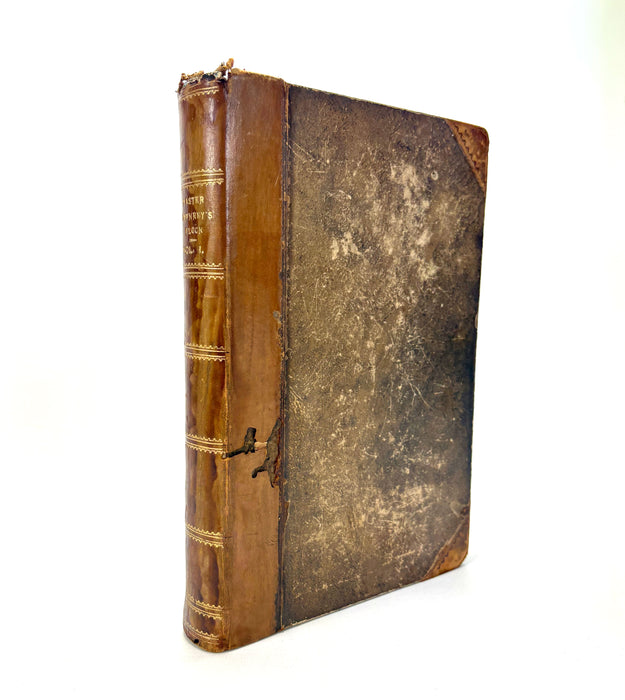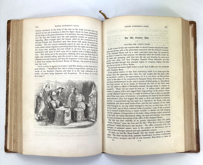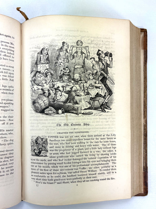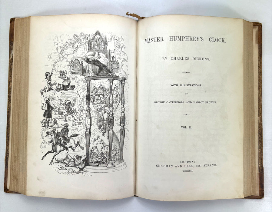 Master Humphrey’s Clock began in 1840 as Dickens’s weekly miscellany of tales and sketches narrated by “Master Humphrey,” but soon became the serial vehicle for The Old Curiosity Shop (1840–41) and later Barnaby Rudge. The book edition was generally issued in three volumes; in this copy, the first two volumes are bound together, concluding The Old Curiosity Shop and introducing the next tale, Barnaby Rudge. The third and final volume is not included here.