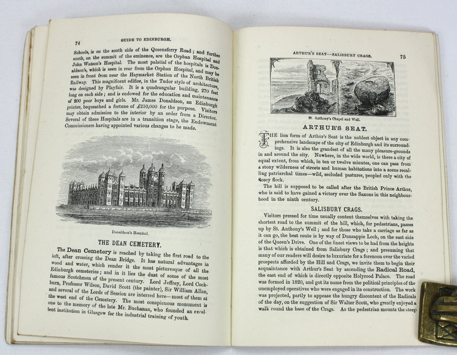 Benjie's Guide to Edinburgh and Vicinity. Including Roslin, Hawthornden, Aberdour, Linlithgow, North Berwick, Abbotsford, melrose, and Dryborough Abbey with a Plan of the City, and Forty-Seven Illustrations. Published by Duncan Macara, Edinburgh. Sixteenth Edition. Undated, but c. 1900. vii + 1pp Advertisement + Fold-out map + 127pp +. 1pp +xvi Advertisements. Good overall. Cover a little discolored and worn. Some spotting to pages at beginning and end. Text mainly bright and clean. Some pencil annotations to final text page;