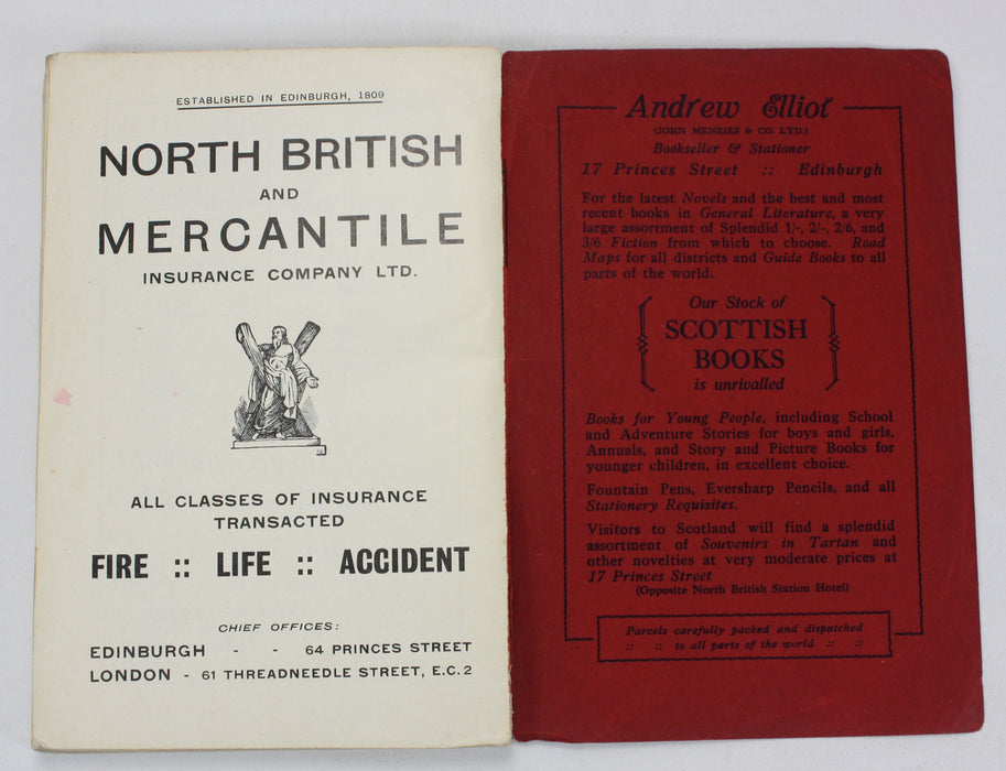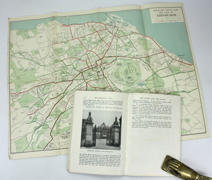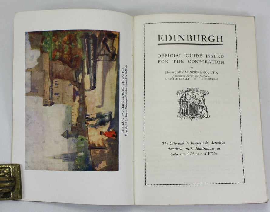 Edinburgh; Official Guide Issued by the Corporation by Messrs John Menzies & Co., Ltd, Edinburgh. Undated, with previous owner's pencil annotation for 1934. Wraps with some soiling and wear. Handwritten 'Edinburgh' to spine. With loose fold-out colour map. 192pp. Text mainly bright and clean;