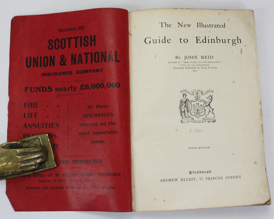 The New Illustrated Guide to Edinburgh, by John Reid. Published by Andrew Elliot, Edinburgh. Tenth Edition. Undated but previous owner's pencil date of 'c. 1906'. With printed red wraps, worn and soiled. Text generally bright and clean. viii + 148pp + 20pp Advertisements;