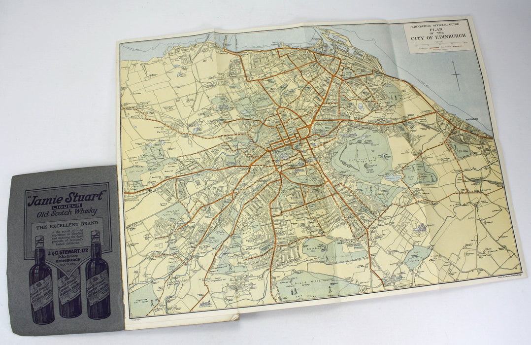 Edinburgh; Official Guide Issued for the Corporation; The City and its Interests & Activities described, with Illustrations in Colour and Black and White. Printed by Morrison & Gibb Ltd, Tanfield, Ltd, 1929 (date from Preface). Wraps with some wear. With tipped in fold-out colour map at front. viii + 136pp + ix-xvi Advertisements. Text mainly bright and clean;