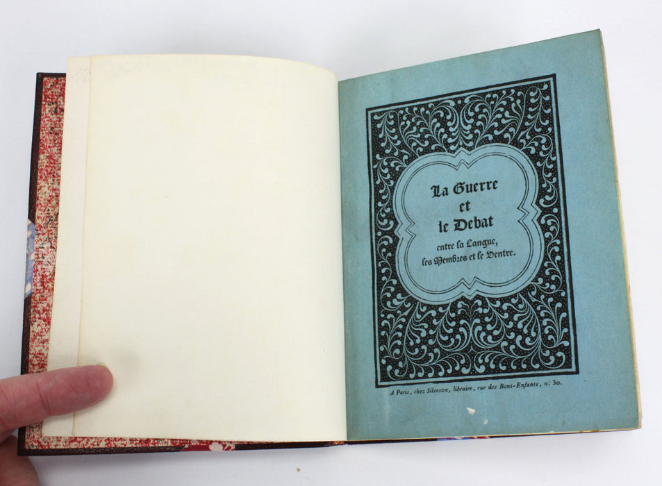 Published 10 May 1840 in conjunction with la Societe des Bibliophiles Francais, printed by Crapelet, and sold at Silvestre, Rue des Bon-Enfants, Paris. This is a facsimile printing of a work by the French poet and author, Jean (or Jehan) d'Abundance, originally published in the 16th Century.