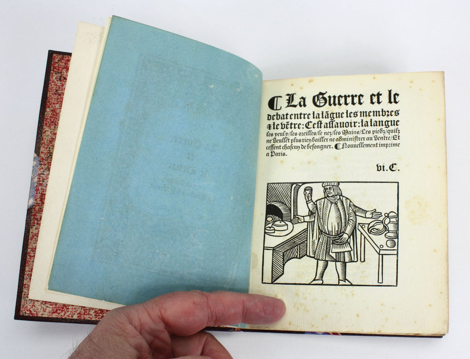A very good copy of this scarce publication. Rebound in a beautiful fine binding; three quarters leather with marbled boards. Cover with 5 raised bands and gilt title. Spine is sun faded (though in an attractive manner). A beautiful little book, with blue title pages and the facsimile faithfully reproduced with varying page widths as issued, and wonderful woodcuts. Occasional light foxing. A most attractive book.