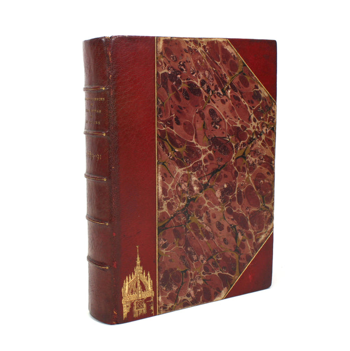 A very good hardback with red leather spine and corners, with gilt decoration, with St Giles cathedral motif on front cover. Raised bands to spine and marbled paper over boards. Some wear to extremities and a little scuffed and discolored in places, but all soundly bound. Marbled endpapers.
