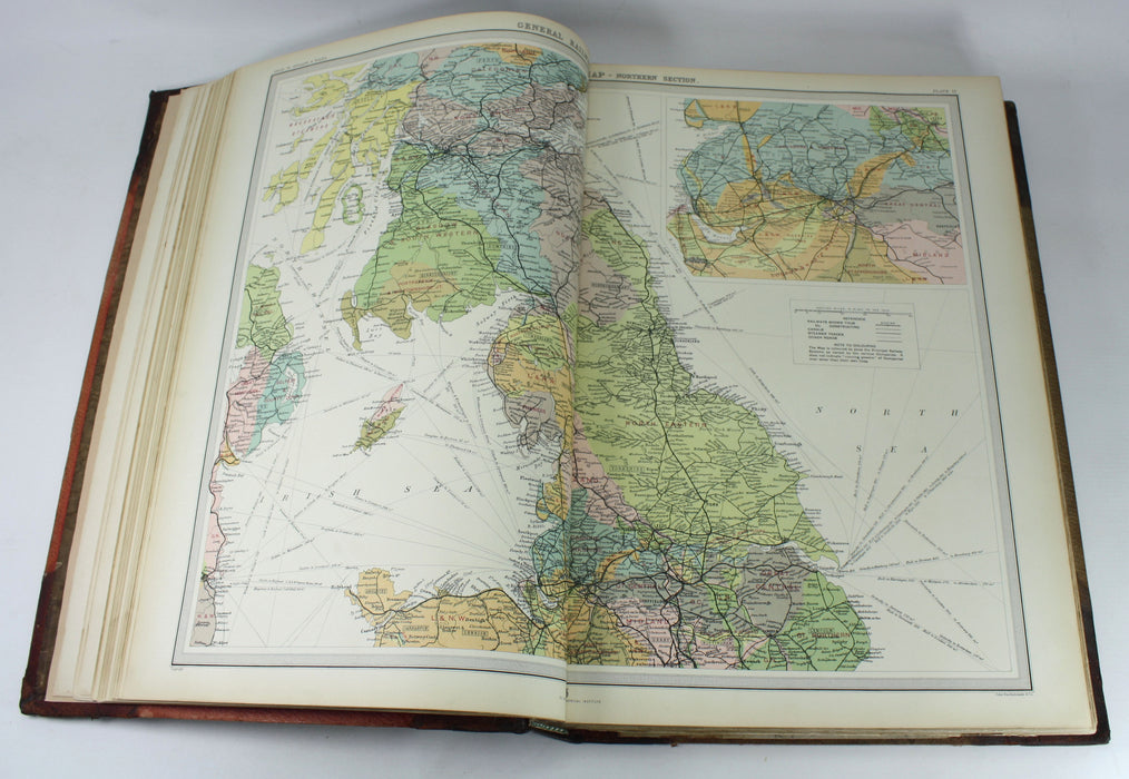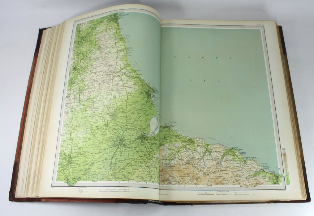 A very substantial early 20th Century atlas with an impressive collection of colour plates. A very good copy after professional restoration. Original covers remounted and binding completely secured. New leather spine with title label. Rubbing and soiling to boards. The original cloth was red, but the front cover has discolored to brown. Embossed crest to front cover.