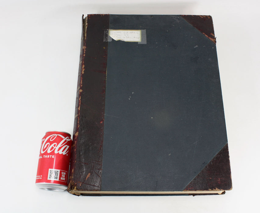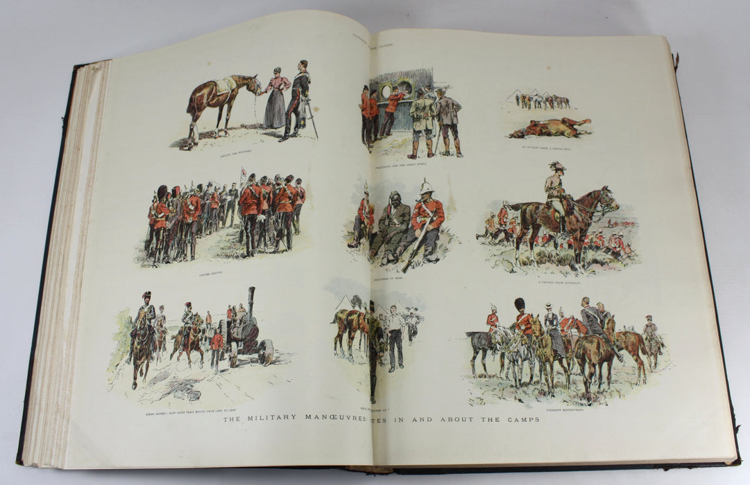 Large format hardback bindings with cloth and leather spine and corners. Covers are heavily worn - bumped and rubbed with some splitting to outer hinges and inner joints, making a loose binding (which is not unusual for volumes of this weight). Inside, most of the text pages are actually very good. They are generally clean and in nice condition for a weekly of this age. There will be flaws - occasional page tears, foxing, stamp, creasing or loose page, but still a wonderful item to have.
