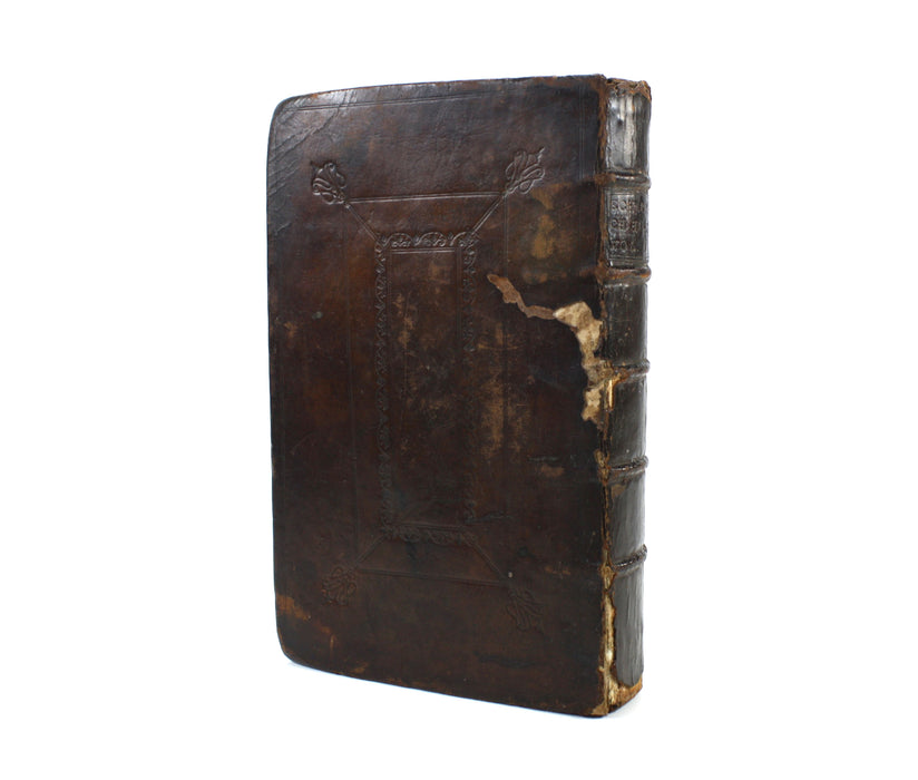 A good full calf leather hardback with incised panel decoration. Raised bands to spine. Covers are worn, bumped and scuffed, with some losses to leather on the rear. Hinges are weak and cracked, but covers held securely by their binding cords.
