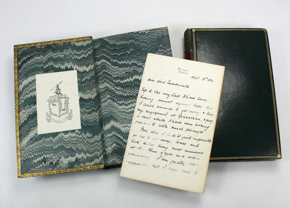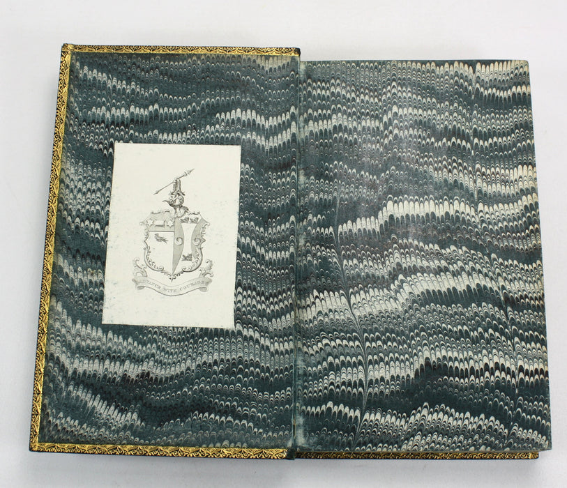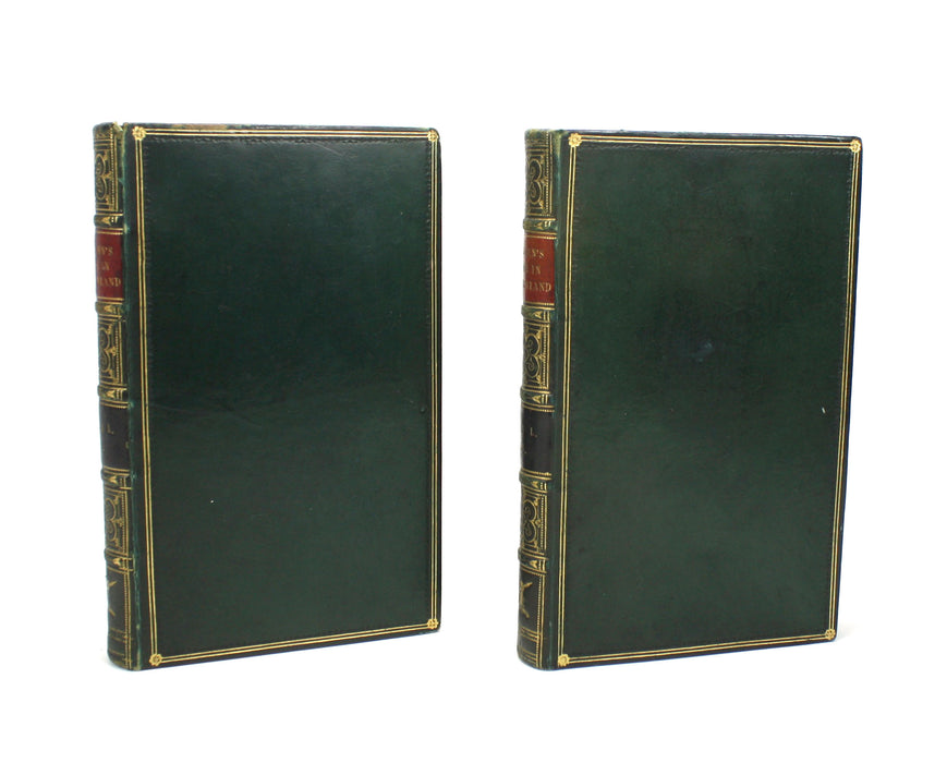 A very good set of 2 full green leather volumes with gilt borders to covers and raised bands and gilt decoration to spine. With red and black morocco labels with gilt titles. Some scuffs and scrapes to leather and a little light wear to covers. Feathered marble endpapers with matching edges of text block. 'Advance with Courage' armorial bookplate to first pastedown of both volumes. This is the motto of the Marjoribanks family. Small bookbinder's stamp to first blank endpaper in each volume.