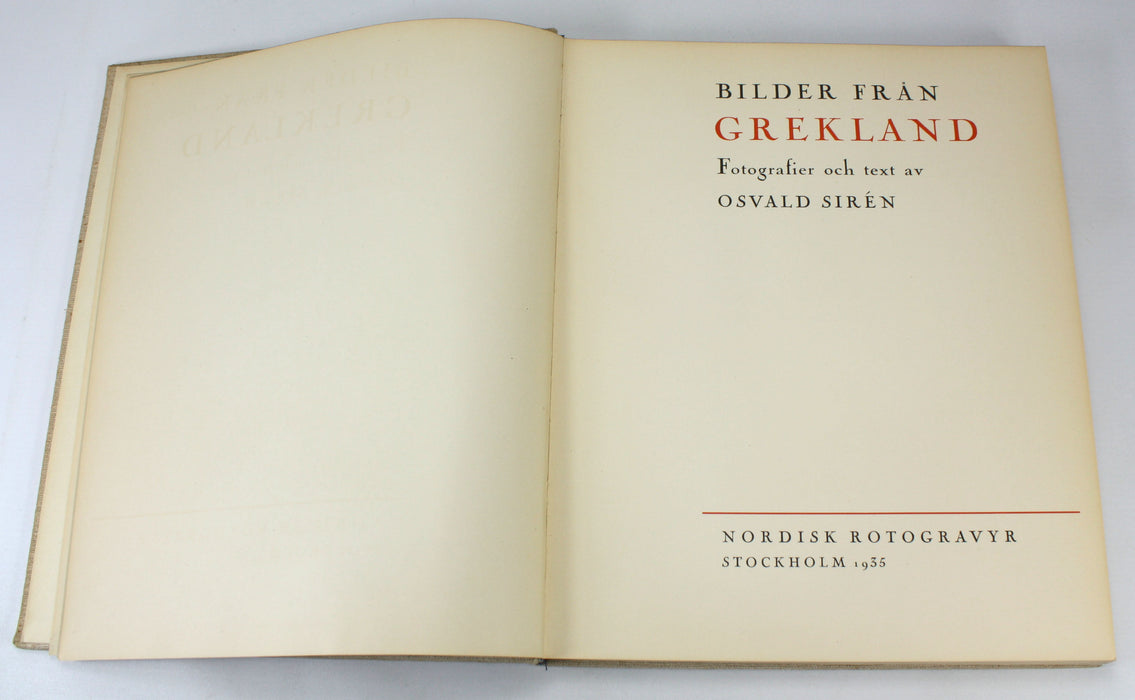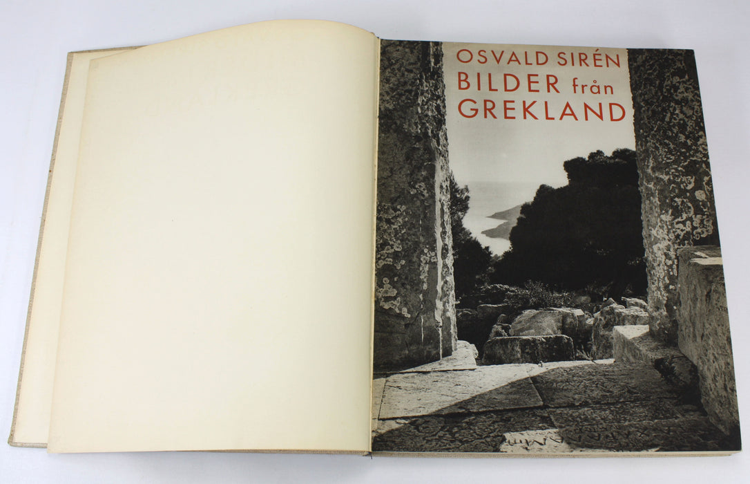 Bilder från Grekland; Fotografier och text av Osvald Siren (Pictures From Greece; Photographs and text by Osvald Siren). Comprises 84pp of text with 88pp of black and white plates plus fold-out maps. The photographs are of excellent quality.