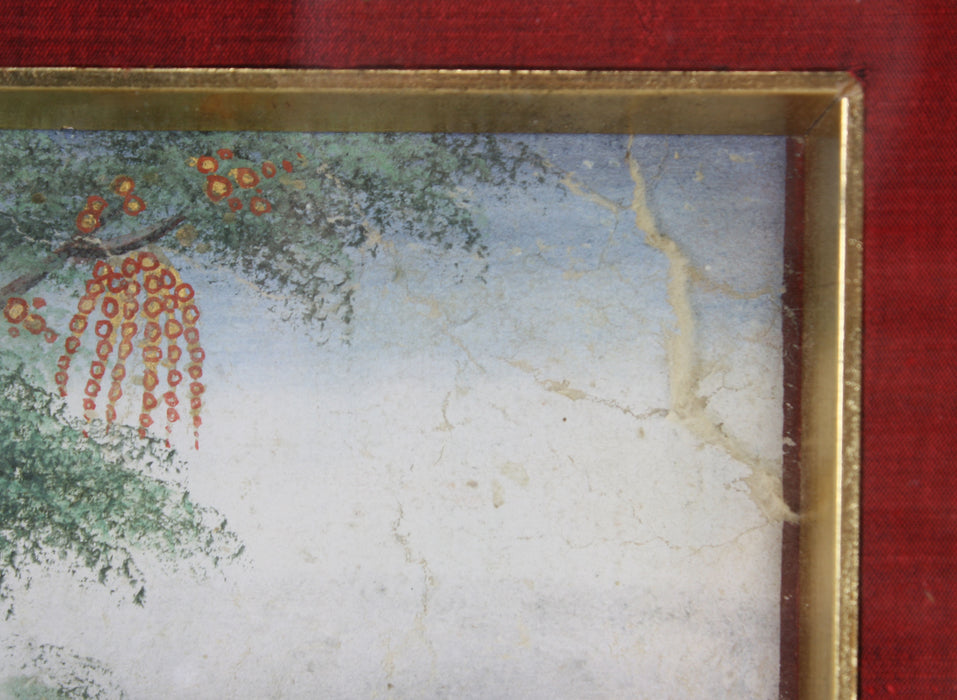 The manuscript painting is framed in a modern gilt frame, behind glass, with a red silk recessed mount with gold leaf interior. With hanging wire at rear.