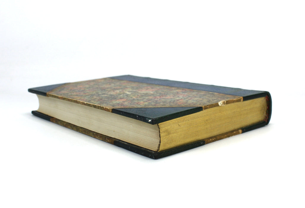 A very good hardback with leather spine and corners. Raised bands with gilt decoration. Blue leather (faded to spine, and with a fade mark to front) and marbled paper over boards. Some shelf wear and rubbing. Small indentation to top edge of front cover. Previous owner's signature in pencil to endpaper. Some offsetting to endpapers opposite leather corners.