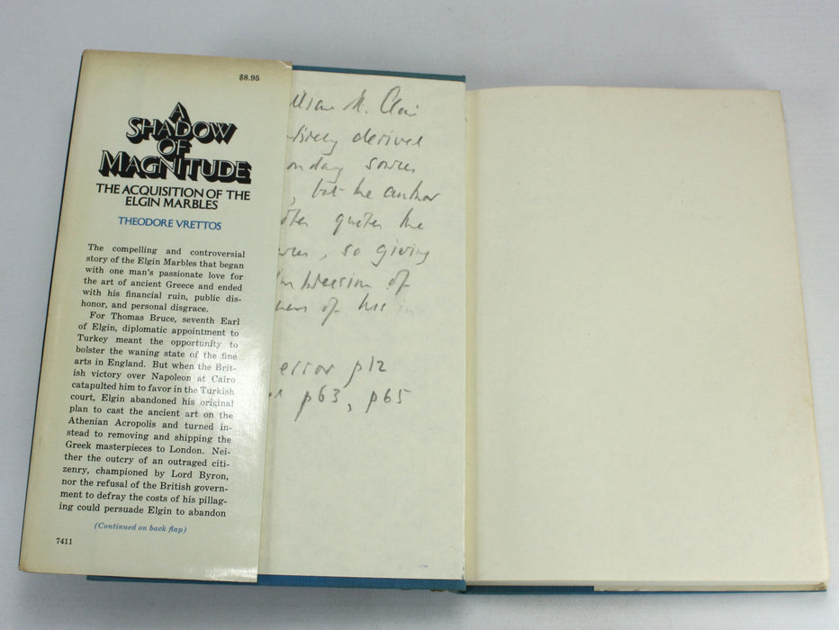 A Shadow of Magnitude; The Acquisition of the Elgin Marbles, Theodore Vrettos, 1974, William St Clair inscribed copy