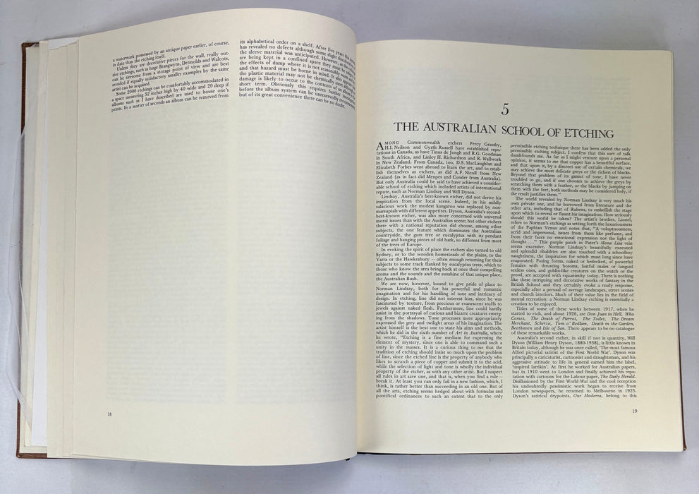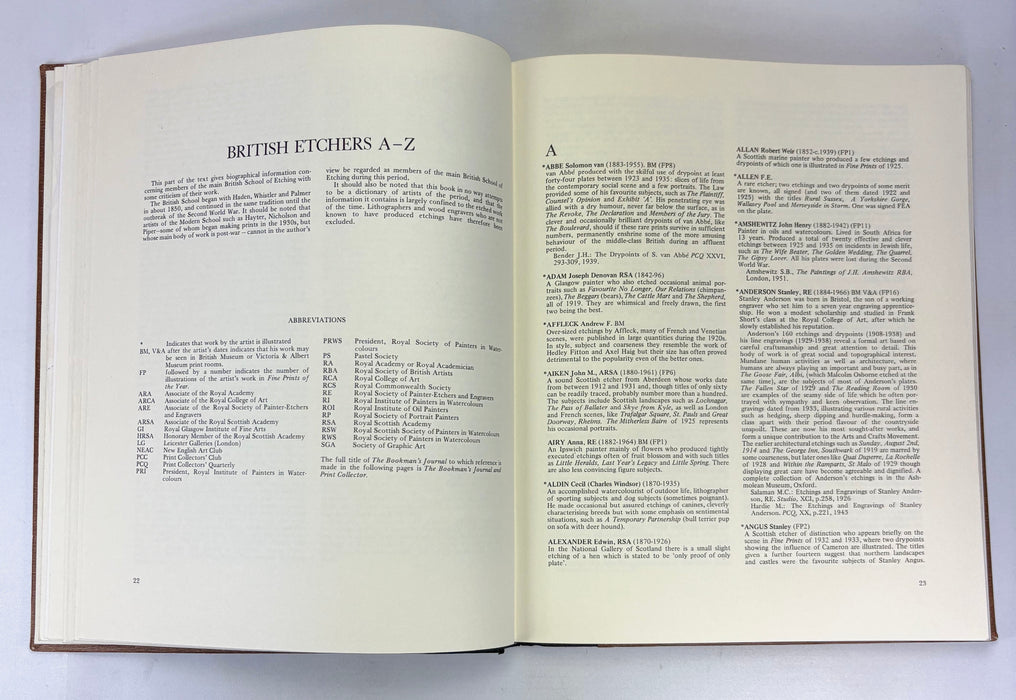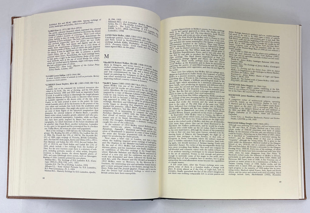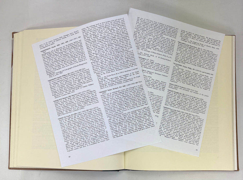 The largest text section of the book gives A-Z biographical information concerning members of the British School of Etching with some criticism of their work. Two of the spreads have no text printed on them at all (p54-55 and p58-59). Instead loose leaf white photocopies have been loosely inserted into the book containing all the missing text! It is not clear whether these sheets were issued by the Publisher (they are larger than standard A4) or whether a previous owner made copies themselves.
