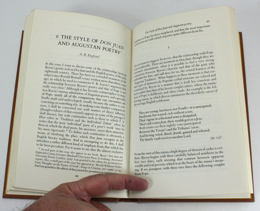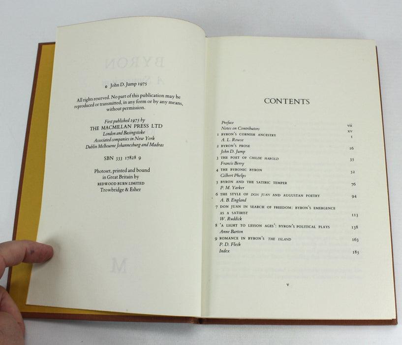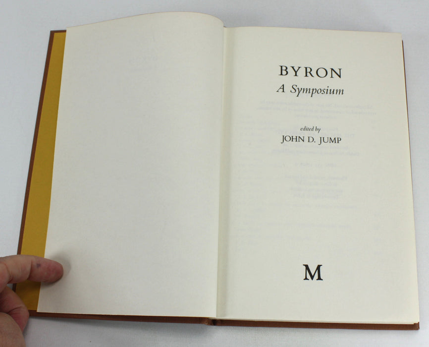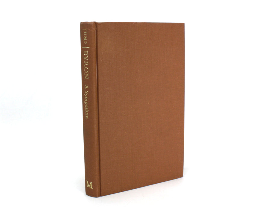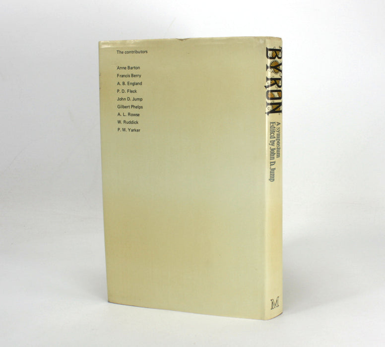 Byron; A Symposium. Edited by John Jump; Most of the essays in this collection derive from lectures given in London, Cambridge and Manchester in commemoration of the 150th anniversary of Byron's death. Various contributors; A. L Rowse, John D. Jump, Francis Berry, Gilbert Phelps, P.M. Yarker, A.B. England, W. Ruddick, Anne Barton, and P.D. Flack. Review copy.