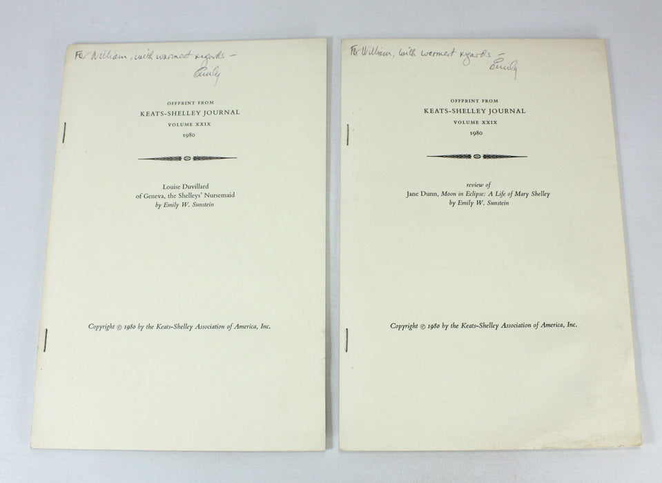 Keats Shelley Journal, Volume XXIX, 1980. Review of Jane Dunn, Moon in Eclipse: A Life of Mary Shelley, by Emily W. Sunstein. Inscribed by the author to William St. Clair, 1980;