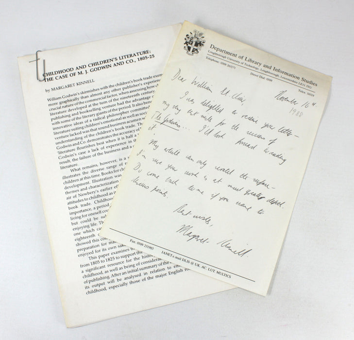 Publishing History 24: Childhood and Children's Literature: The Case of M.J. Godwin and Co., 1802-25, by Margaret Kinnell, and with handwritten letter from the author to William St Clair;