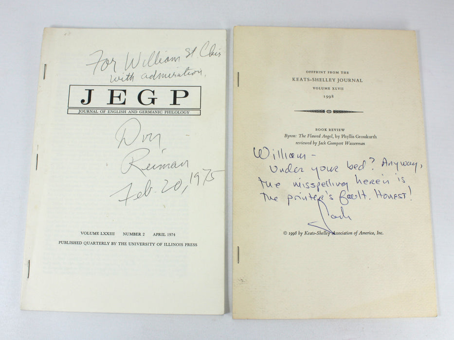 Journal of English and German Philology, Volume LXXIII, Number 2, April 1974; Book Review of The Complete Poetical Works of Percy Bysshe Shelley, edited by Neville Rogers, Volume I, 1802-1813, 1972. Review by Donald H Reiman, and inscribed by him to William St Clair;