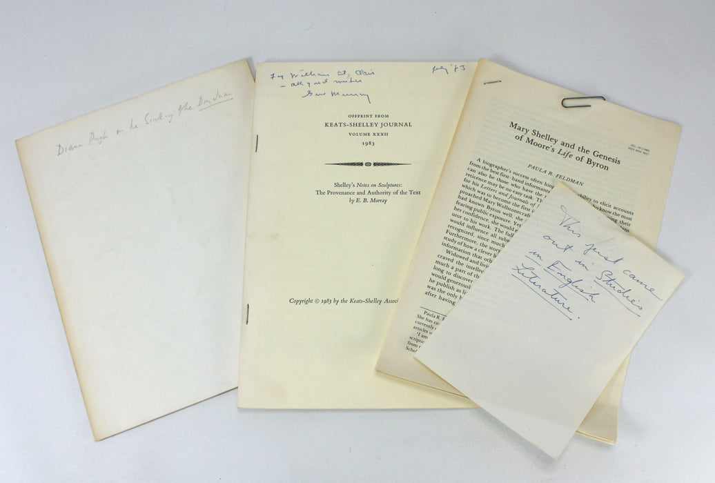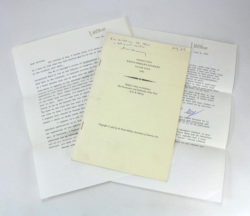 Keats-Shelley Journal Volume XXXII, 1983; Shelley's Notes on Sculptures: The Provenance and Authority of the Text, by E.B. Murray. Author inscribed, and includes 2 personal letters to William St Clair;