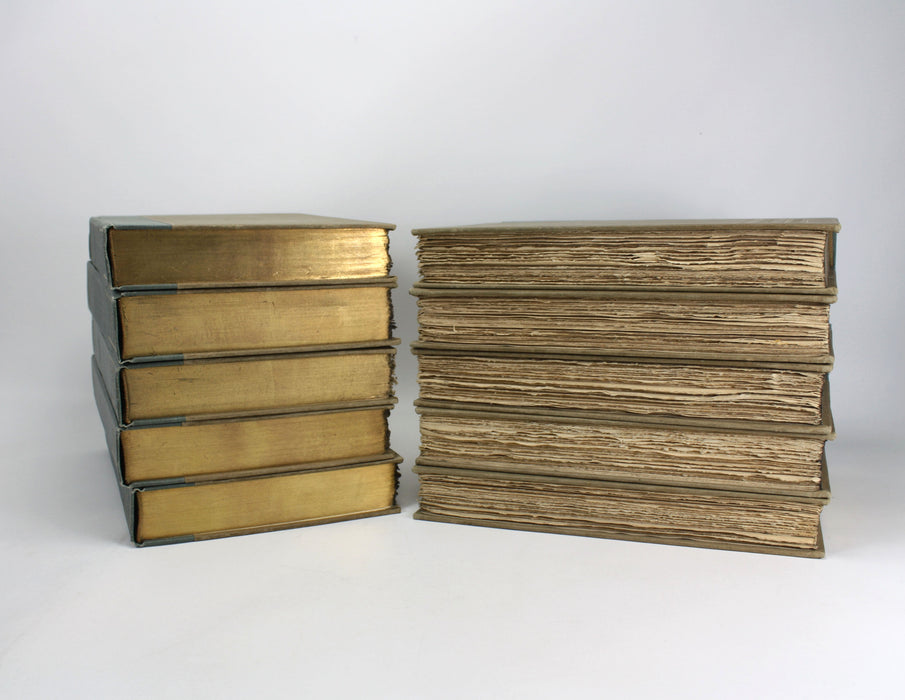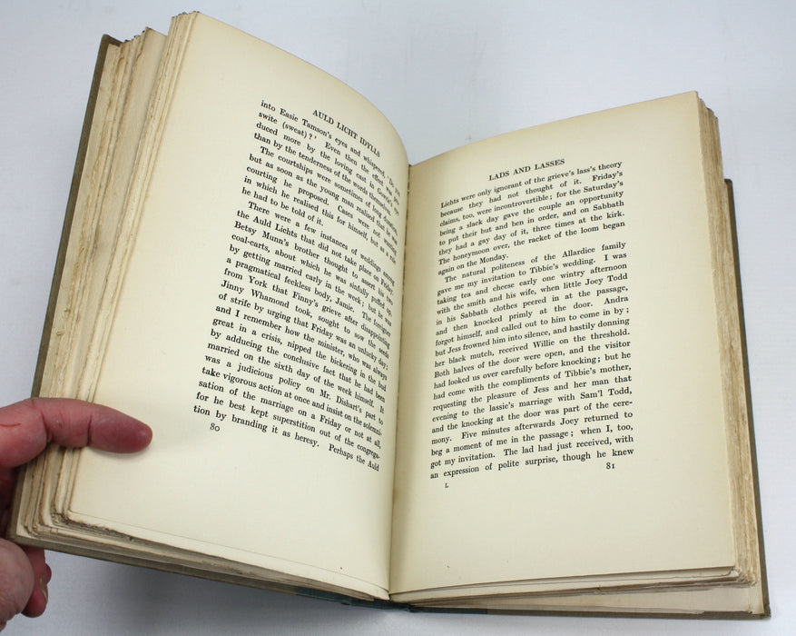 A very good hardback set with green linen covers and paper over boards, with gilt titles, and gilt Kirriemuir roundel to rear. Covers have minor scuffs and rubbings, with minor discolorations and marks, but a very presentable set overall. Soundly bound throughout with only 2 volumes showing any splitting at the front endpaper joint, not affecting overall binding integrity. Free endpapers are age discolored, as is common for this set. Text pages have gilt top edge an are uncut as issued. Text is beautifully clean throughout and possibly unread. An attractive set.
