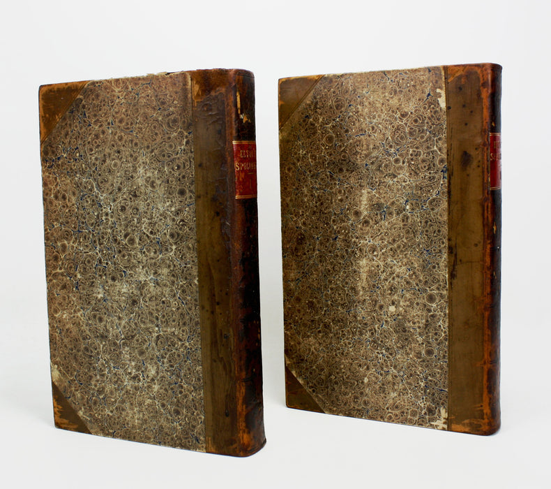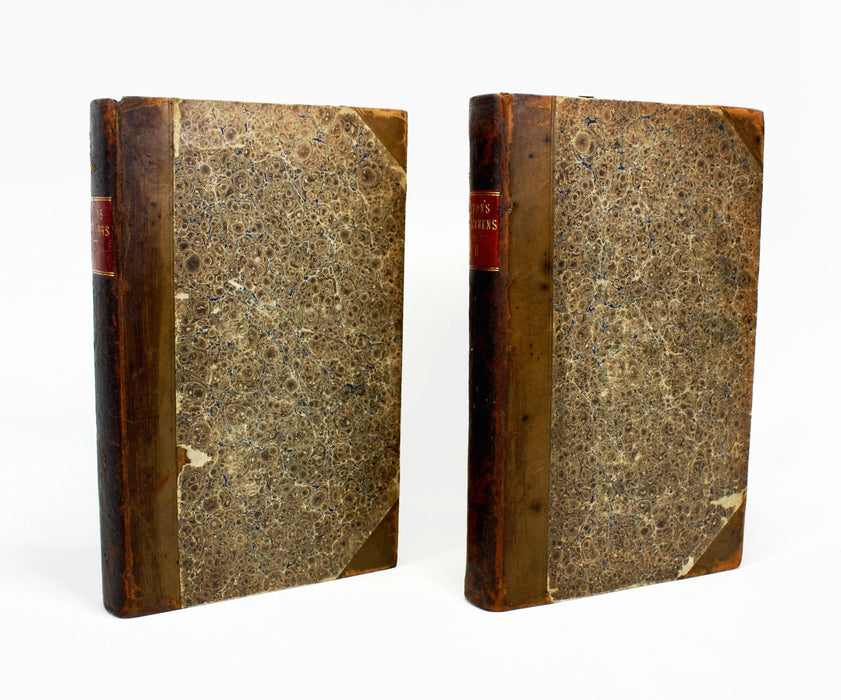 A good set of hardbacks with brown leather spine and corners, and red morocco label to spine. Marbled paper over boards. Covers are worn, scuffed and rubbed, and outer hinges a little weak, but all holding well.
