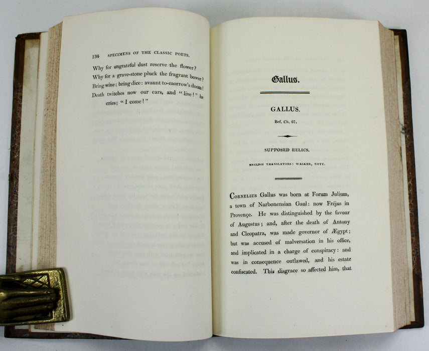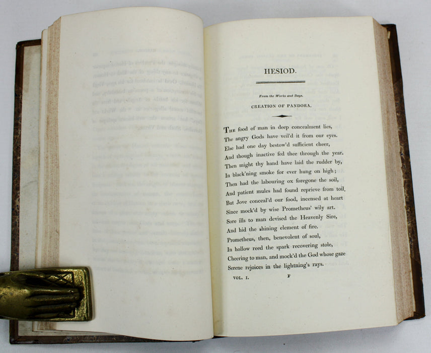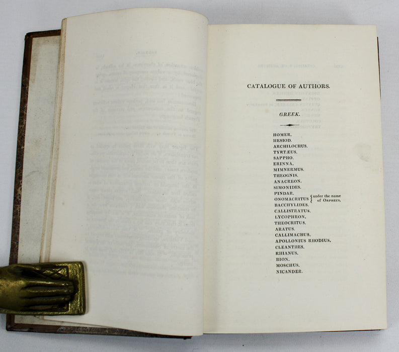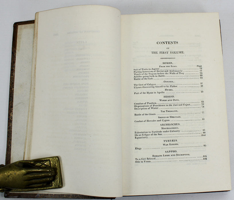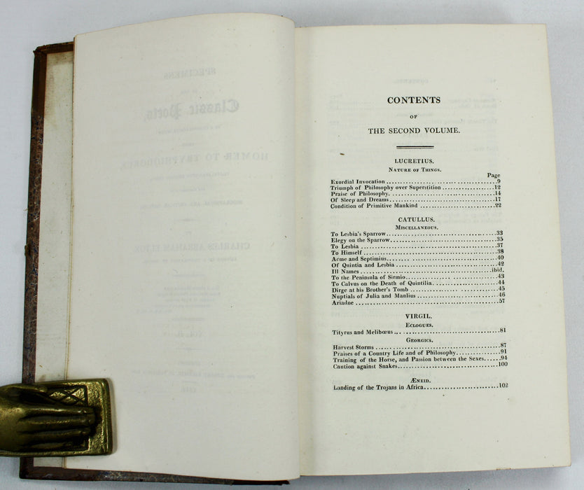 Specimens of the Classic Poets in a Chronological Series from Homer to Tryphiodorus, Translated into English Verse, And Illustrated with Biographical and Critical Notices, by Charles Abraham Elton. In Three Volumes - included here are Volumes I and II only. Often referred to as 'Elton's Specimens', as per the title label on the spines.