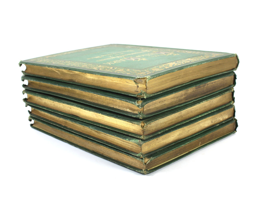 A good set of green cloth hardbacks with elaborate gilt decoration. Covers are worn, scuffed and bumped. Frayed to head and tail of spine and extremities and 2 volumes with nicks in the cloth on the spines. Most of the endpapers are cracked at joints to various degrees. Some with small booksellers' stickers to endpapers.