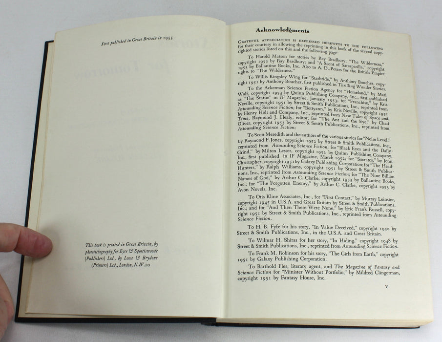 Stories for Tomorrow; An Anthology of Modern Science Fiction. Selections and Prefaces by William Sloane. An excellent collection of science fiction stories, including works by Ray Bradbury, Arthur C. Clarke, Murray Leinster, amongst many others.