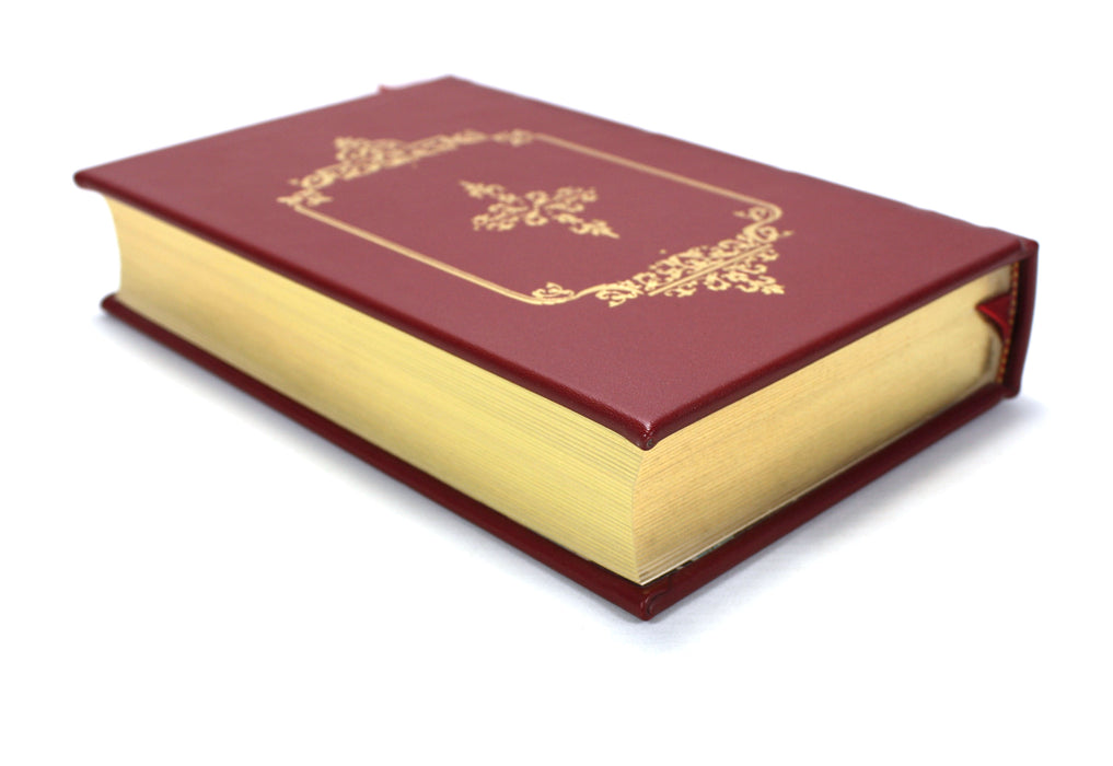 A fine copy, in a very attractive full dark red leather binding, with gilt decoration and raised bands to spine. With marbled endpapers, shiny gilt edges to text block and red satin page marker ribbon.