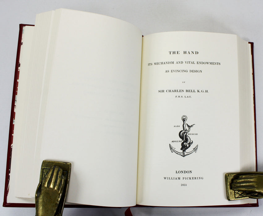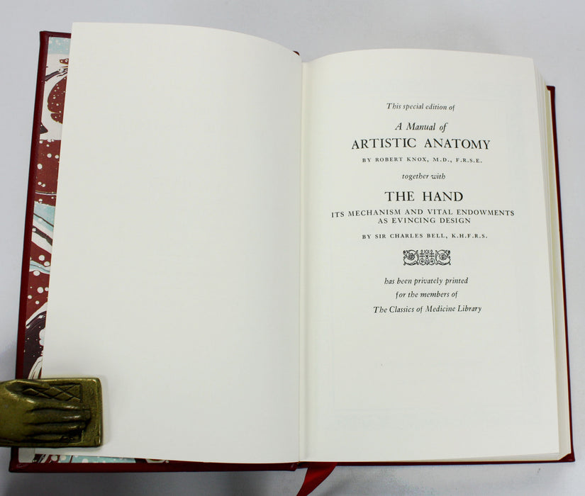 Privately printed for the members of The Classics of Medicine Library, a Division of Gryphon Editions, Ltd., Birmingham, Alabama, 1985. This lovely edition features a reprint of A Manual of Artistic Anatomy, for the Use of Sculptors, Painters, and Amateurs, published by Henry Renshaw of London in 1852, and; The Hand; Its Mechanism and Vital Endowments as Evincing Design, published by William Pickering of London in 1833.