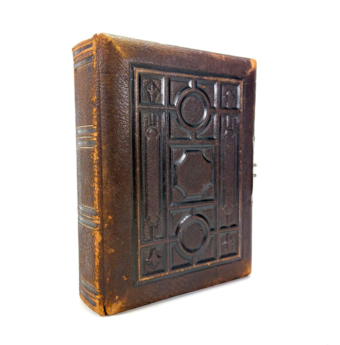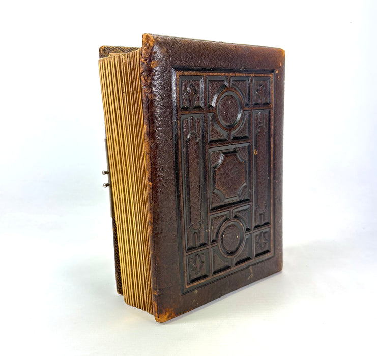 The album itself is of leather with an embossed panel cover design to front and rear. With metal lock to front cover edge, but no matching clasp on rear. Leather is worn and rubbed. The album contains 20 card leaves, cabable of holding one cabinet card per side, which have gilt edges. Many of these card leaves carry damage such as tears or losses, but the photographs themselves are in very good condition - with excellent definition and a dark sepia tone.