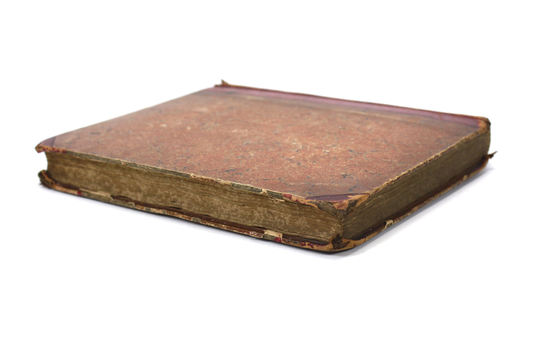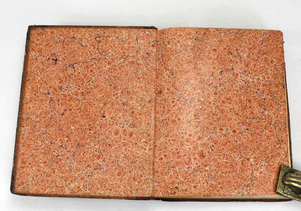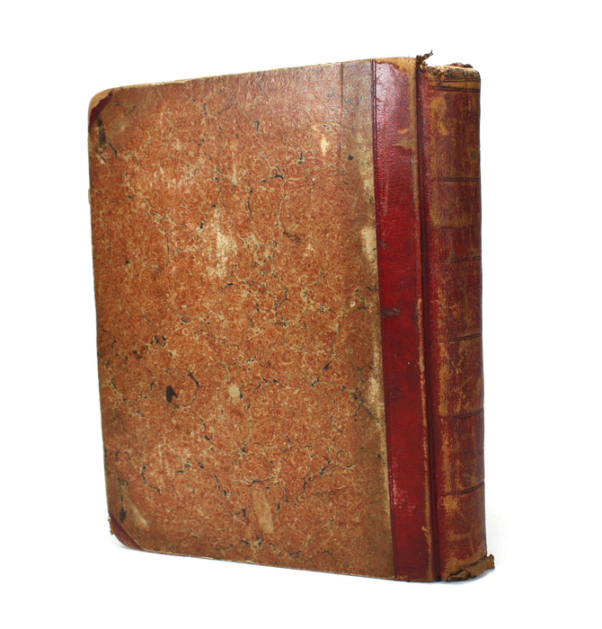 A good hardback with marbled paper over boards, with red leather spine and corners. The leather is heavily worn, scuffed and bumped and the boards scuffed and worn to extremities. Marbled endpapers with previous owner's bookplate to first free endpaper, verso. Cracked  to gutter after first free endpaper.