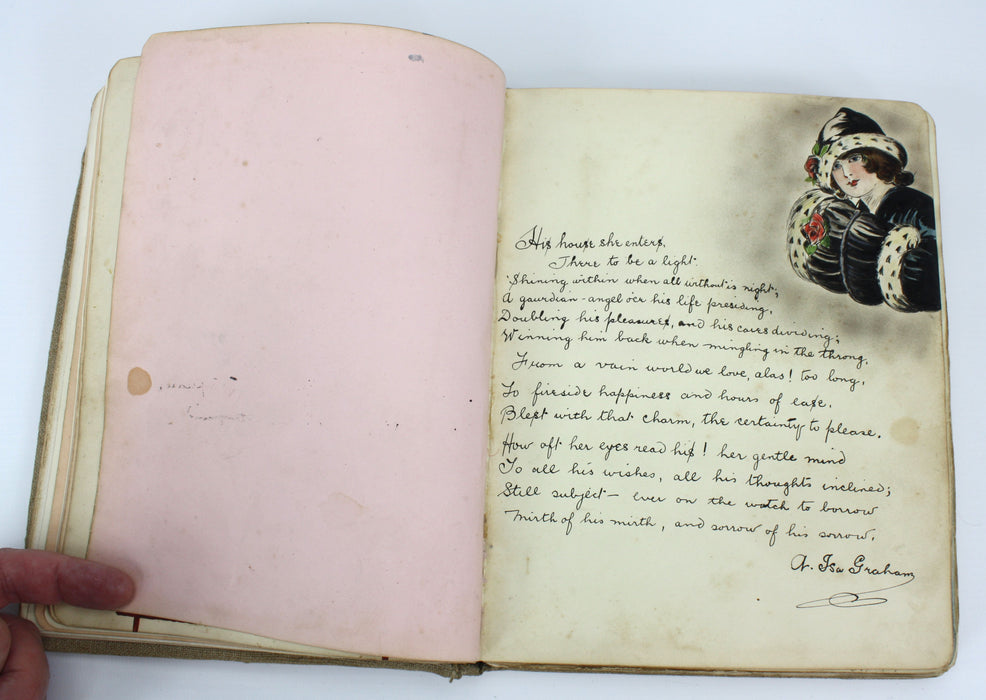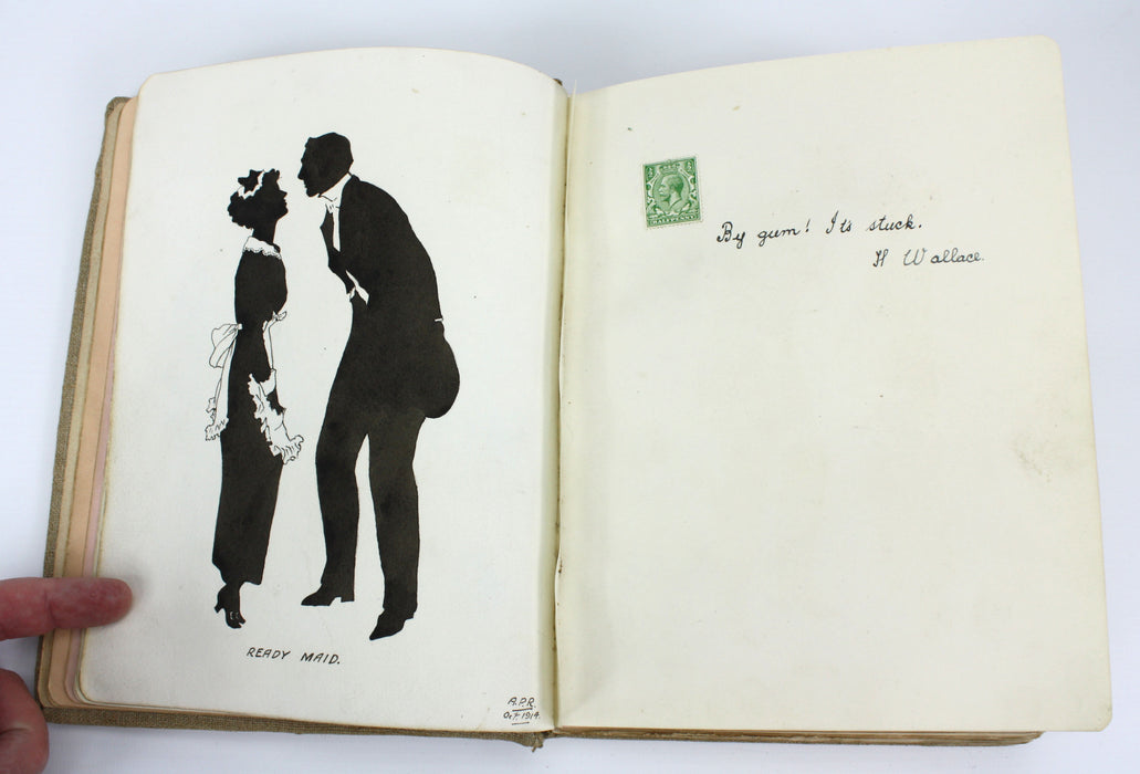 The first written page is the owner of the album asking (in amusing style) for a gift of friendship of one small work of art for their album, and then for it to be returned with a signature.