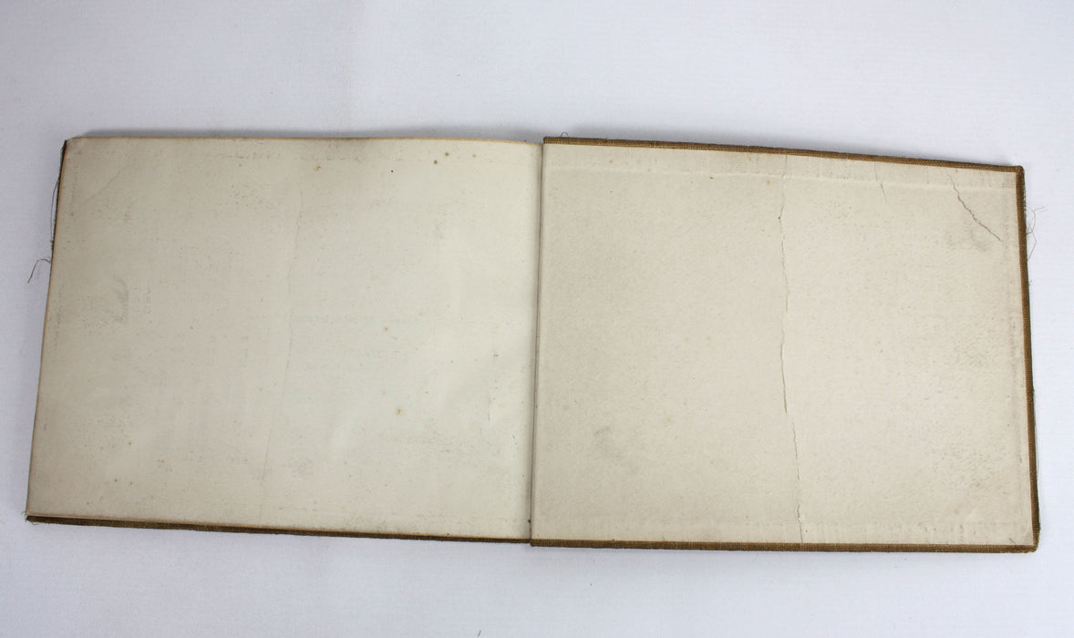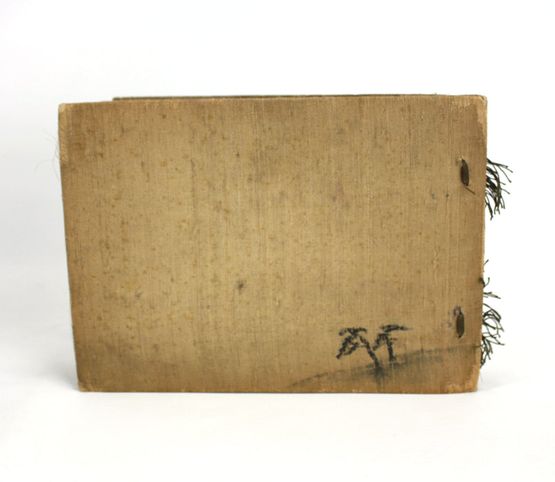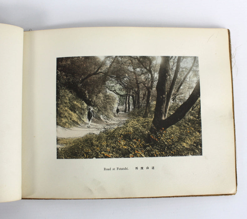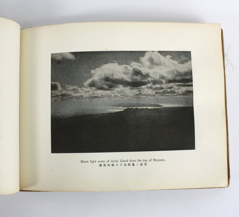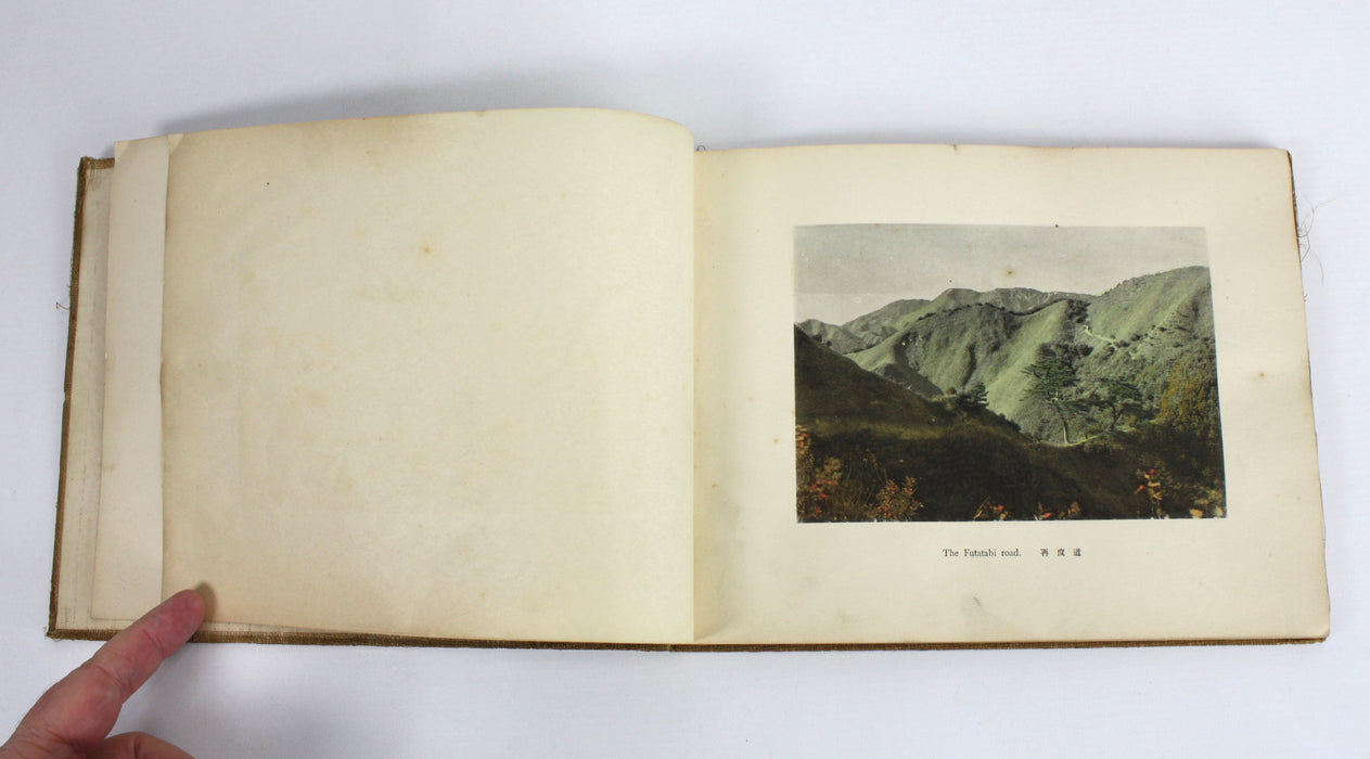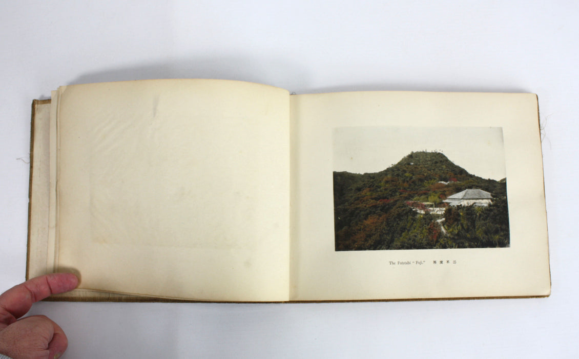 Hand painted covers with fabric over boards, with thread ties. Covers a little soiled and worn with frayed extremities. Inside rear creased. Text pages are very good with some age discoloration. Consists of 20 x tissue guarded printed photographs annotated in both Japanese and English. Soundly bound. An attractive and scarce volume.