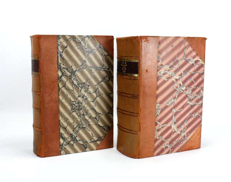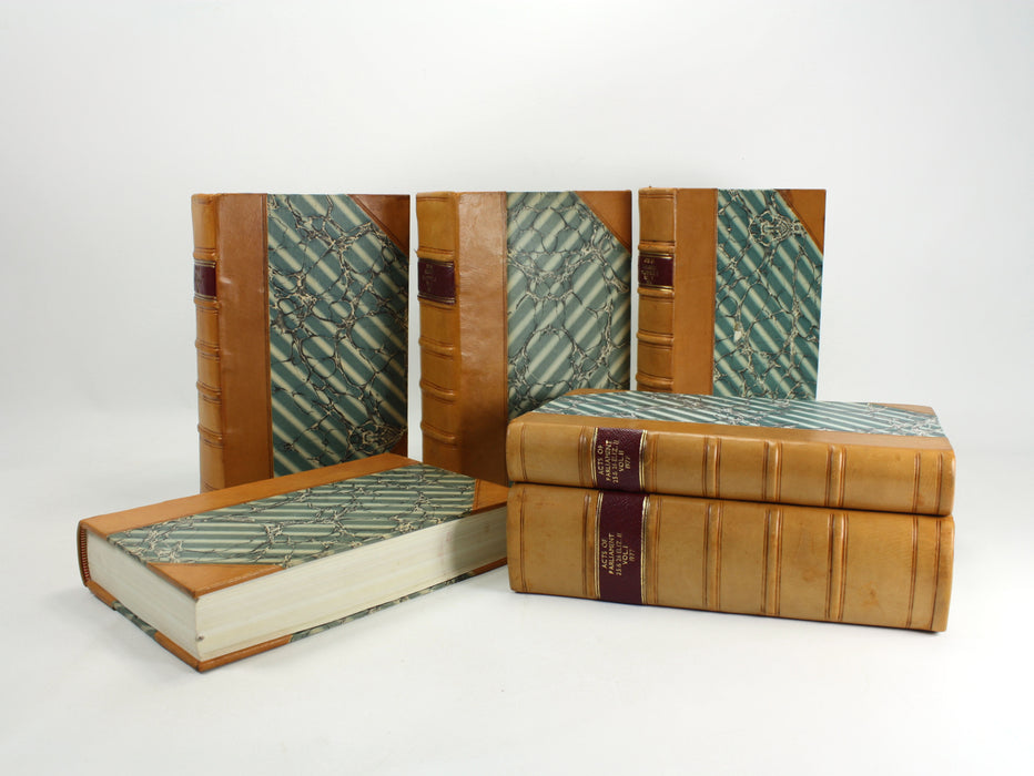 This is a beautiful collection of half leather bound hardback books. Featuring brown leather spines and corner protectors. The spine with raised bands and burgundy/red and gilt title labels. Covers with marbled paper boards. Some books feature the binder's label of Jas. Lumsden, Son & Co, Account Book Makers of 141 Bath Street in Glasgow.