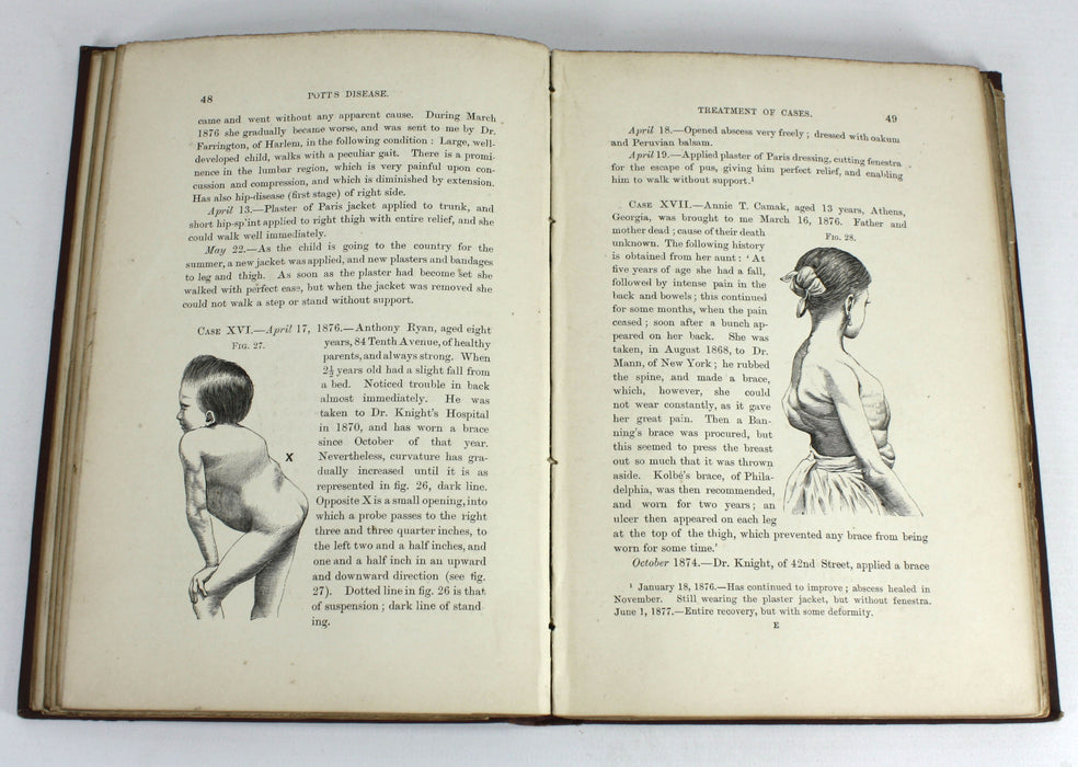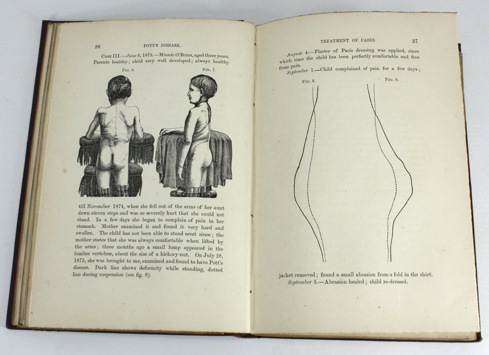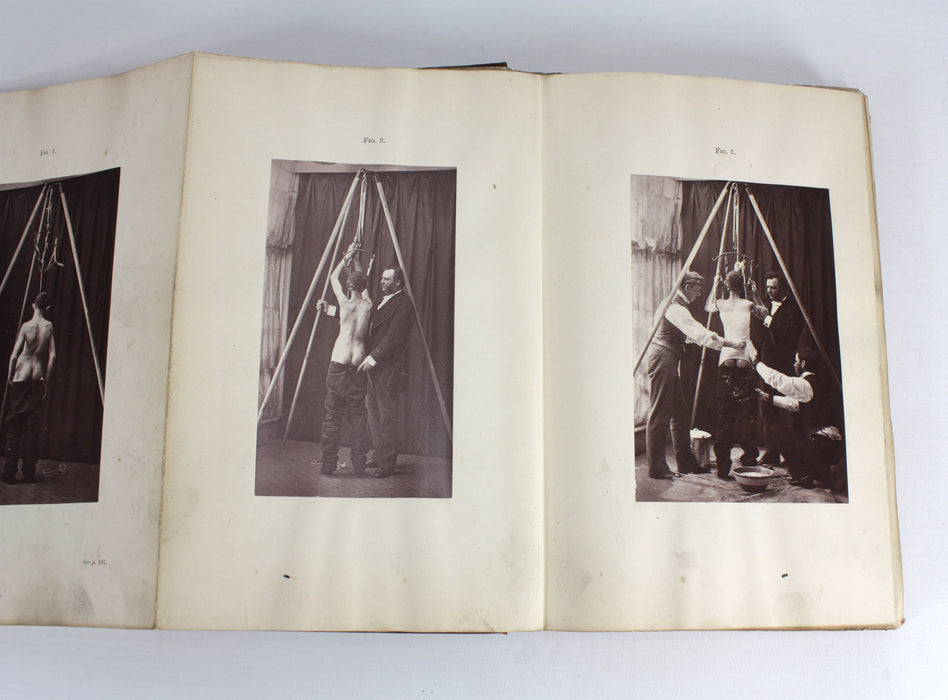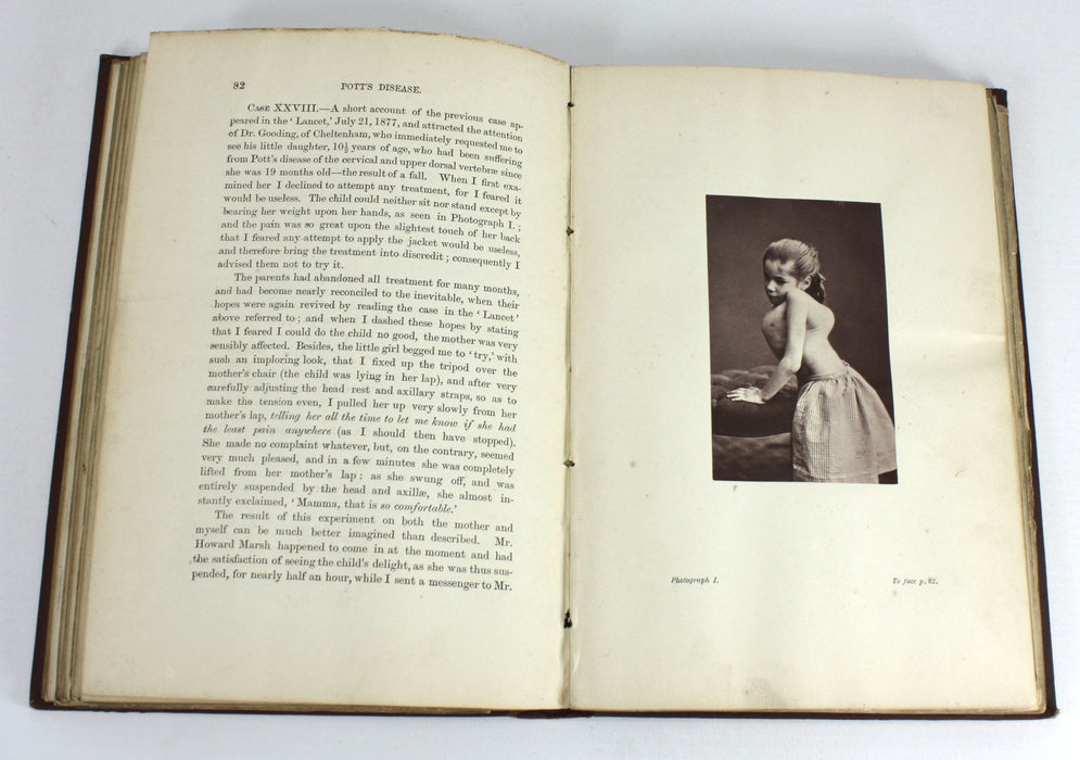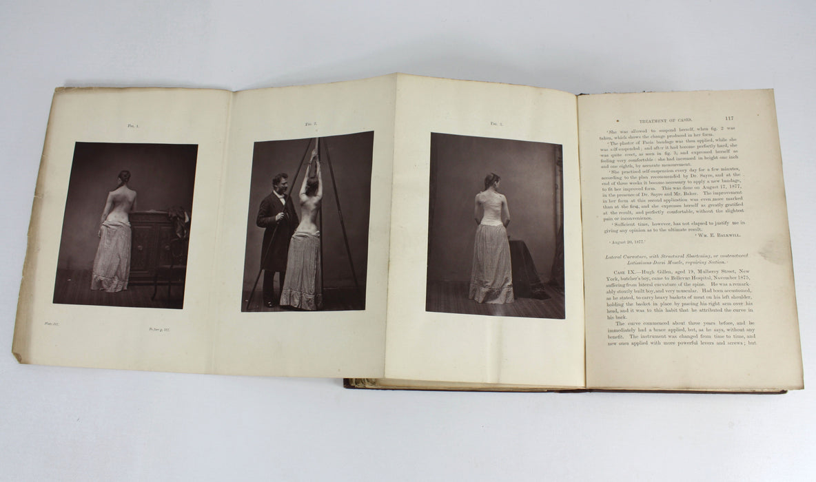 Very scarce first printing of this medical text by Lewis A. Sayre (1820-1900), a leading American 19th Century Orthopaedic Surgeon, and founder of Bellevue Medical College. The book is noted for the artistry of its high quality mounted Woodburytype photographs. Includes 4 x fold-out concertina sections, each with 3-4 photographs, and 4 smaller images on normal pages. There are 19 photographs in total - we believe one leaf of 2 photographs to be missing, facing p. 115. 70 illustrated figures.