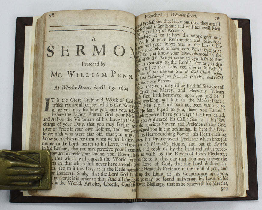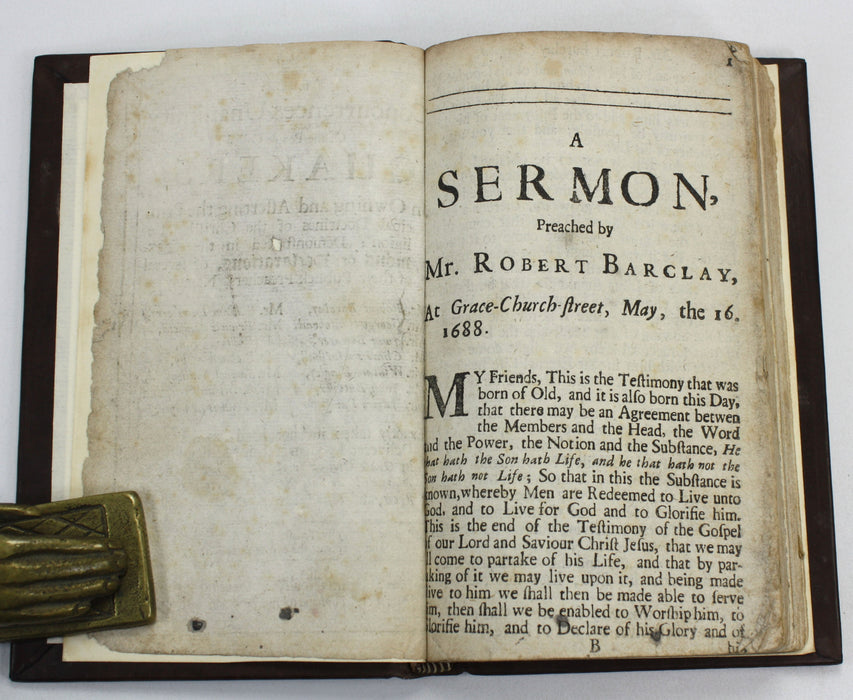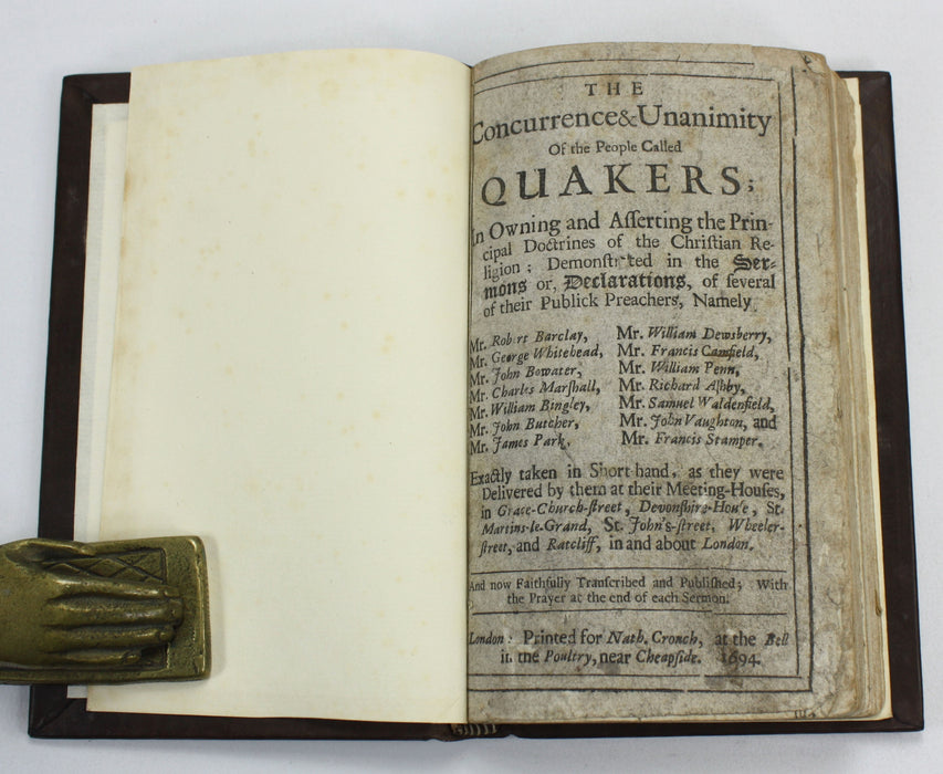 This scarce 1694 first edition, printed by Nath. Crouch of London, is a significant early Quaker publication documenting the unity of belief among the Society of Friends in the late 17th century. The Concurrence & Unanimity of the People Called Quakers gathers sermons from leading Quaker figures of the period  –  including Robert Barclay, George Whitehead, William Penn, and others  –  as taken down in shorthand at London meeting houses and later transcribed for print. Together, these addresses affirm the central doctrines of the Christian faith as understood by the Friends, offering both theological clarity and a rare record of the spoken ministry of some of the movement’s most prominent early voices.