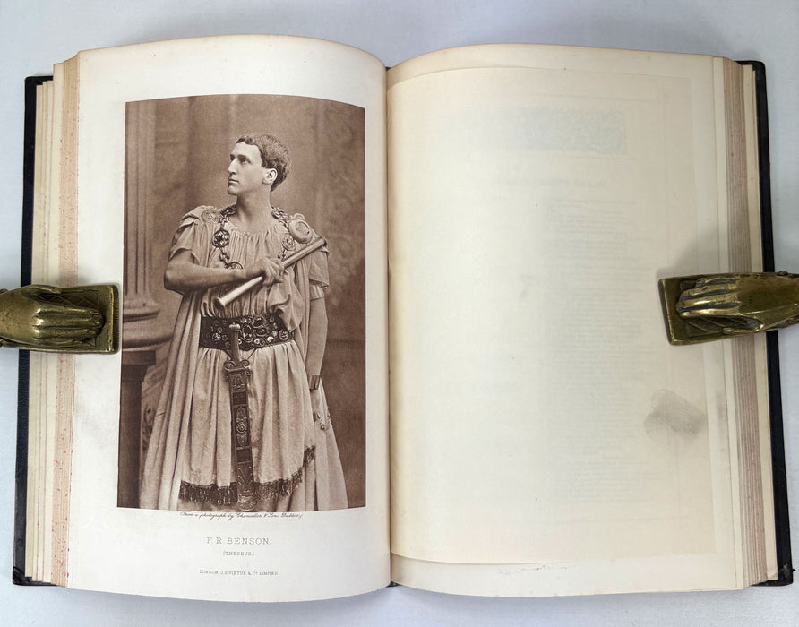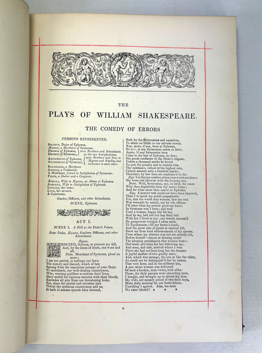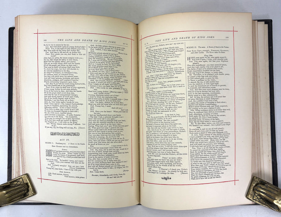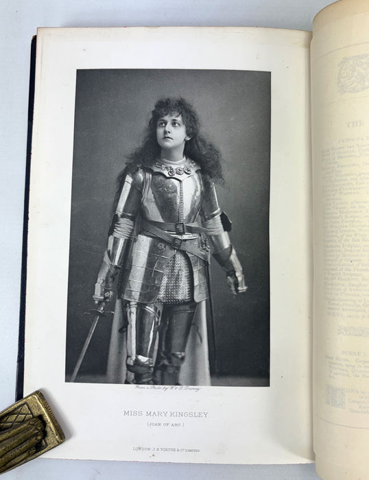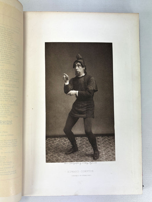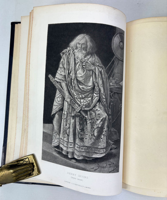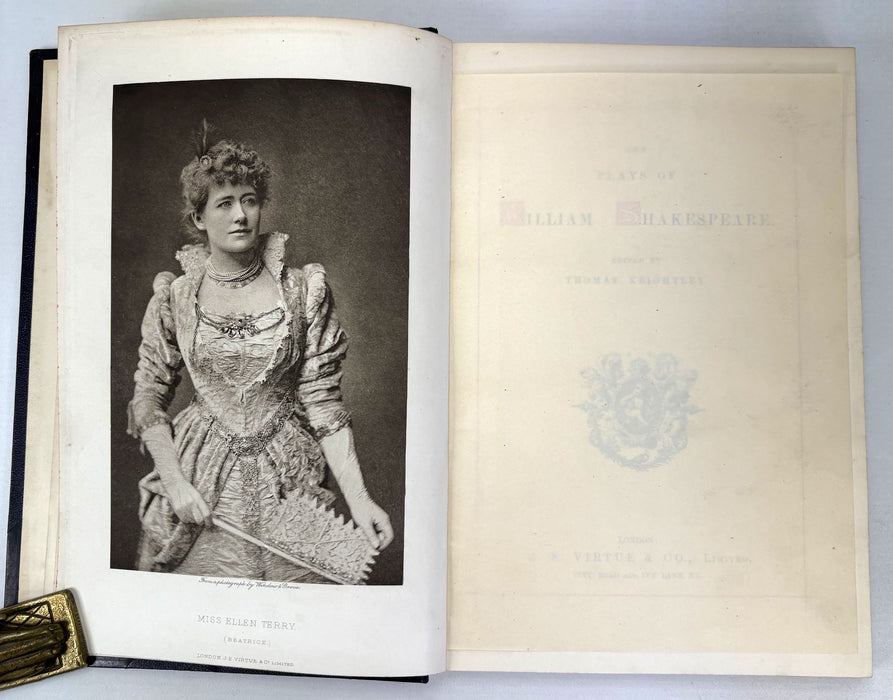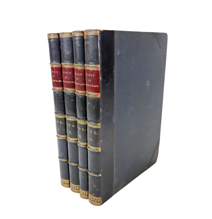 This attractively bound four-volume set of The Plays of William Shakespeare, edited by Thomas Keightley and published by J.S. Virtue & Co. in the early 1890s, presents the Bard’s dramatic works in a richly designed Victorian format. Each volume is illustrated with high-quality photogravure portraits of leading stage actors of the day, offering both literary content and a glimpse into late 19th-century theatrical culture. Elegantly printed with black text framed by red-ruled borders, and bound in leather-backed boards with raised bands and gilt decoration, the set exemplifies the period’s appreciation for Shakespeare as both a national literary figure and a popular cultural icon.