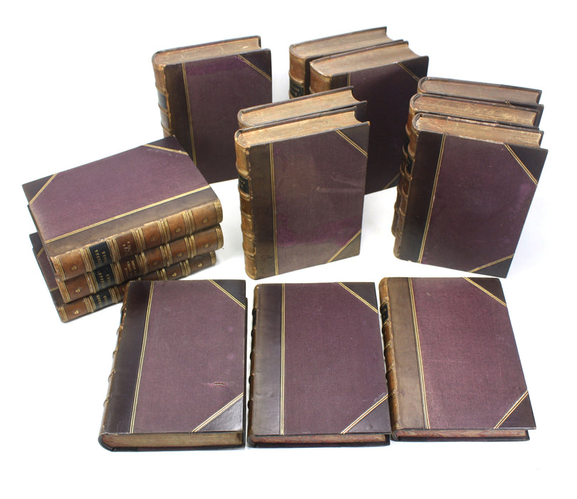 A very good set of hardbacks with leather spines, raised bands, gilt decoration and morocco title labels, along with leather corners. Leather is burgundy in colour, faded to brown on spines. Boards covered with burgundy chagrin style cloth with gilt borders.