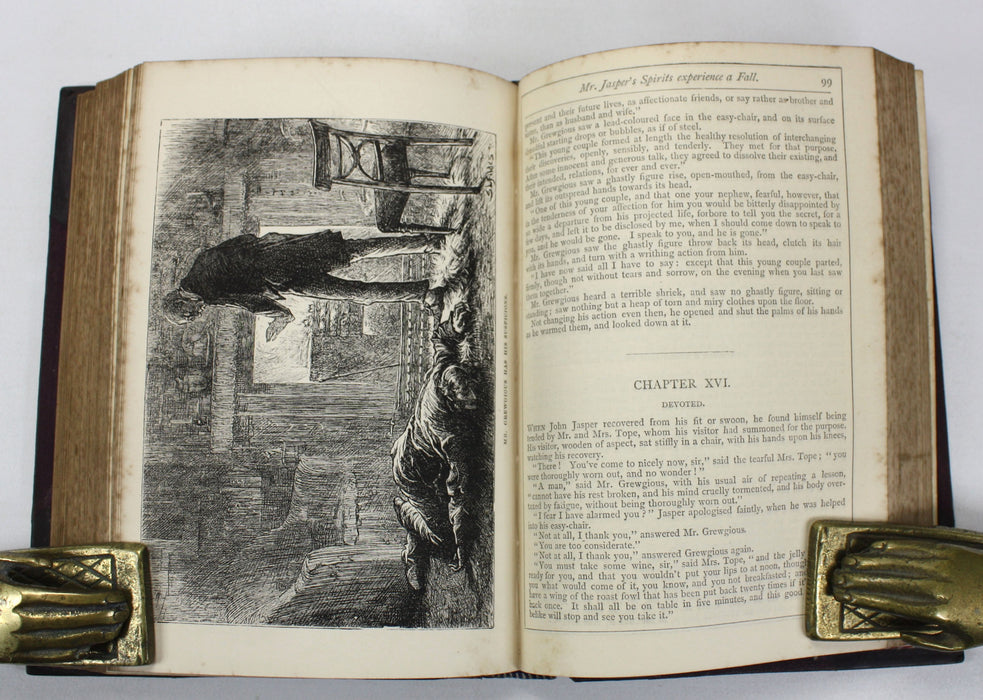 Published by Chapman & Hall, Limited, London. Printed by both William Clowes and Sons Limited, and J.S. Virtue and Co. Limited, London. Presumed first edition thus. Undated, but c. 1870 (though would have been published as a Parts series, possibly over a number of years). There is a Postscript written and dated by Dickens to 1868, so presumably the books were published fairly soon afterwards.