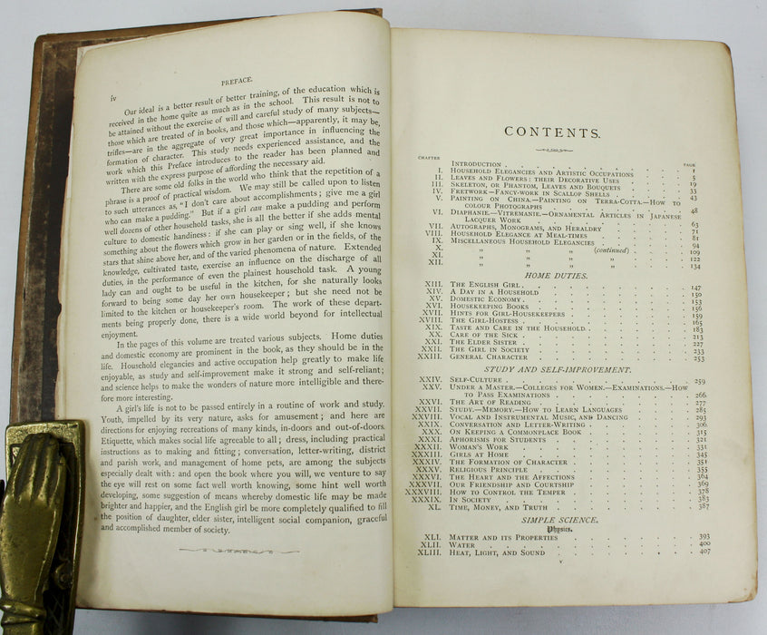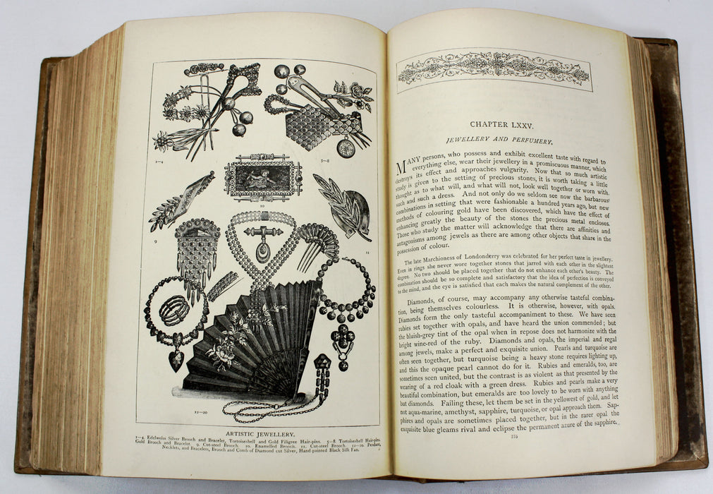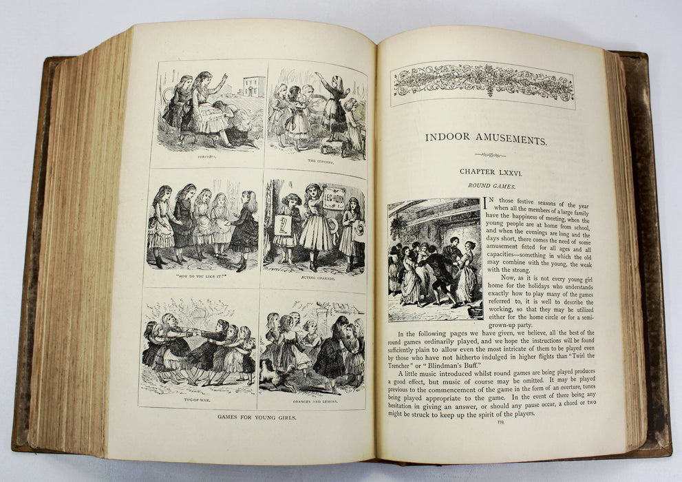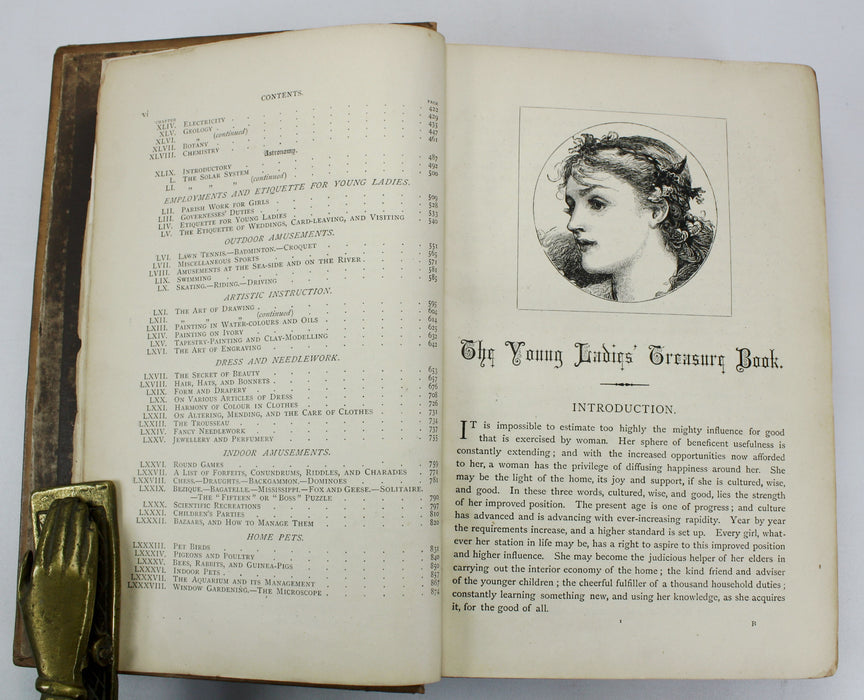 A fascinating and uncommon cornucopia of information for the Victorian young lady covering all manner of subjects including Hobbies and Household Elegances, Home Duties, Study and Self-improvement, Simple Science, Employment and Etiquette, Outdoor Amusements, Artistic Instruction, Dress and Needlework, Indoor Amusements; and Home Pets.