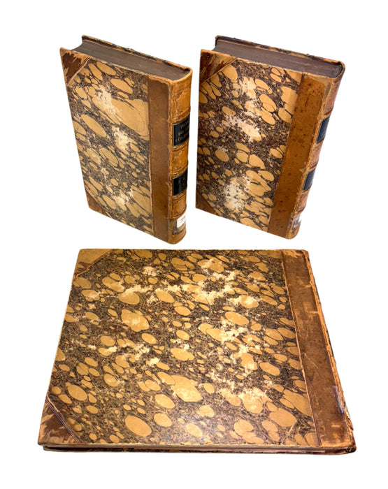 A good set of 3 volumes, each with tan leather spines and corners and marbled paper over boards. With black morocco labels with gilt titles to spines. Covers with scuffing, bumping and wear. Ex-library, with reference number labels near tail of spine. Atlas volume with small loss of leather to tail of spine. With usual reference library labels and markings to endpapers, including official 'Withdrawn from stock' stamp. All soundly bound.
