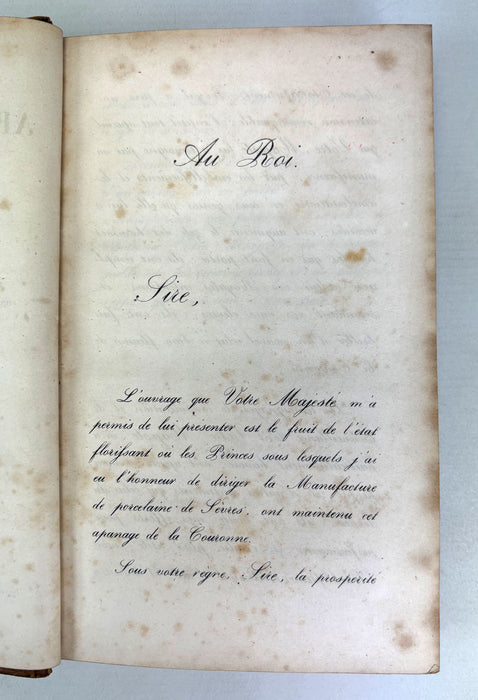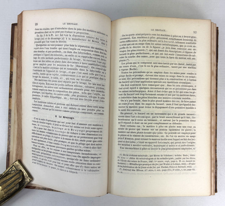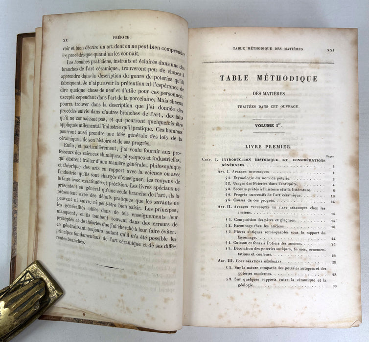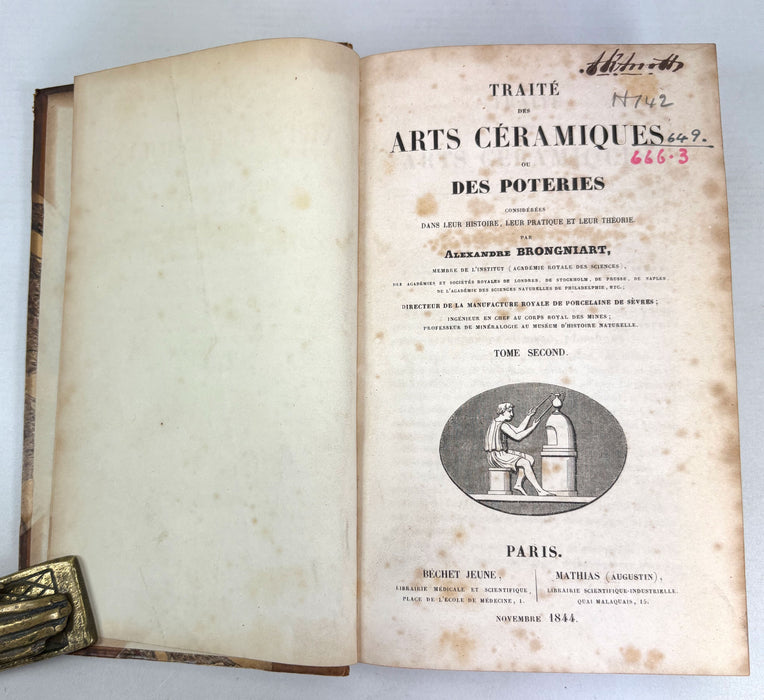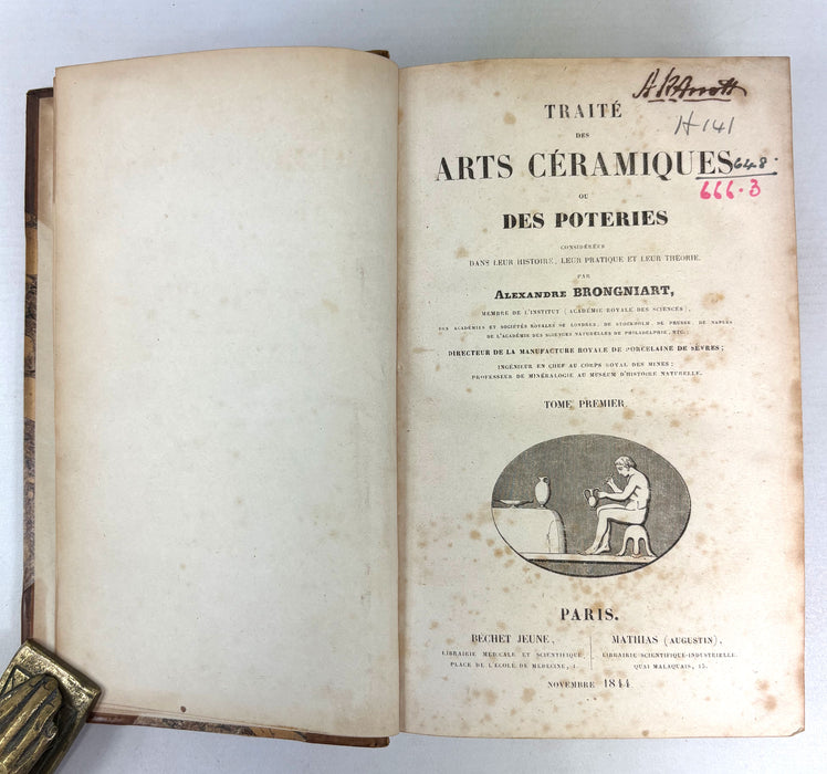 This three-volume first edition of Traité des arts céramiques (1844) by Alexandre Brongniart offers an in-depth study of ceramic arts, encompassing their historical development, practical techniques, and scientific theory. Brongniart (1770–1847), a French chemist, mineralogist, and director of the Sèvres Porcelain Factory, was a key figure in establishing ceramics as both an industrial science and a subject of scholarly research. His work is considered foundational in the field of ceramic technology.
