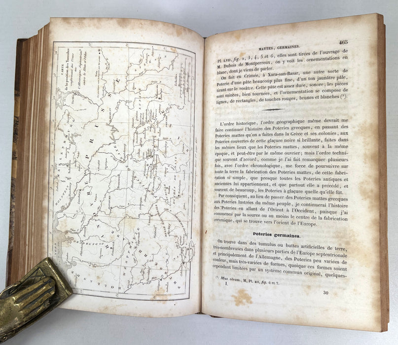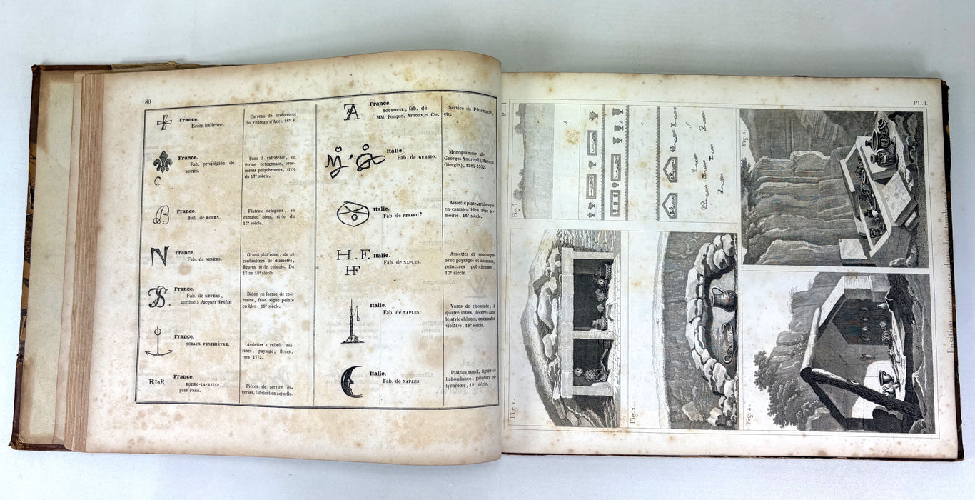 Traité des arts céramiques ou des poteries considérées dans leur histoire, leur pratique et leur théorie, par Alexandre Brongniart. In three volumes, complete - 2 text volumes with some illustrations plus a larger 'Atlas' – primarily a volume of illustrated plates, including colour images.