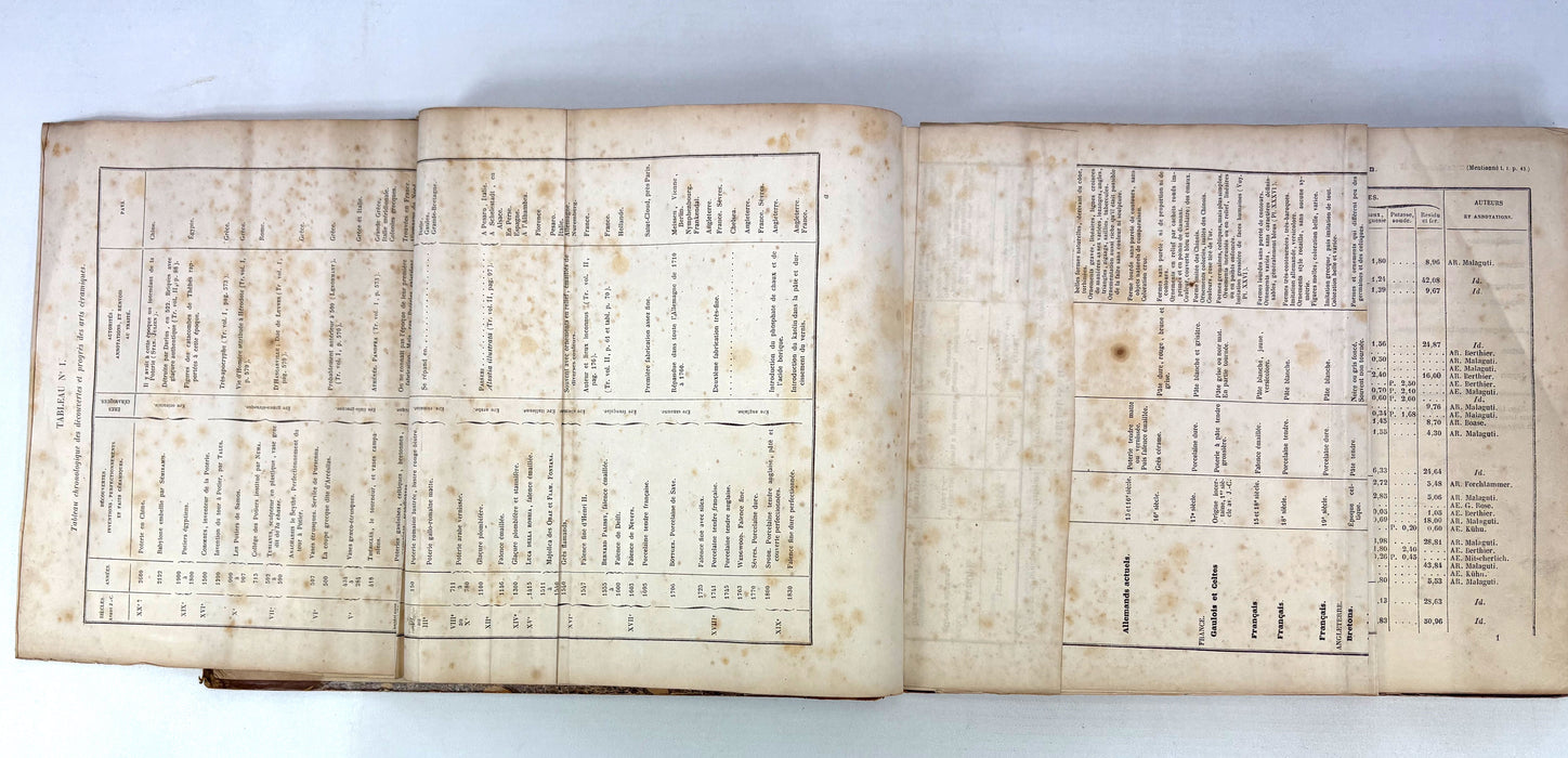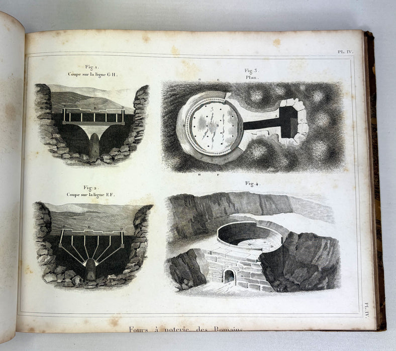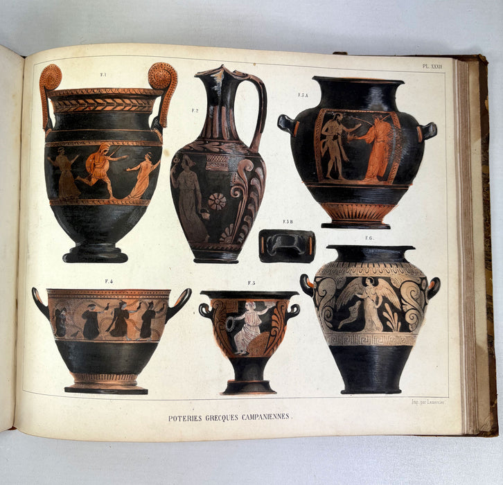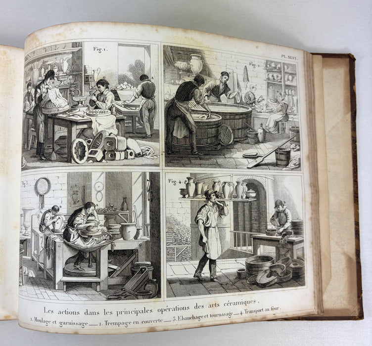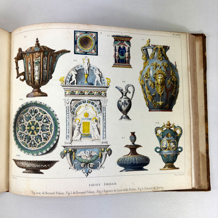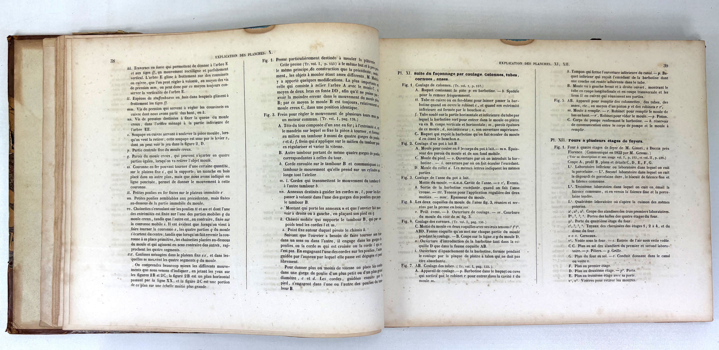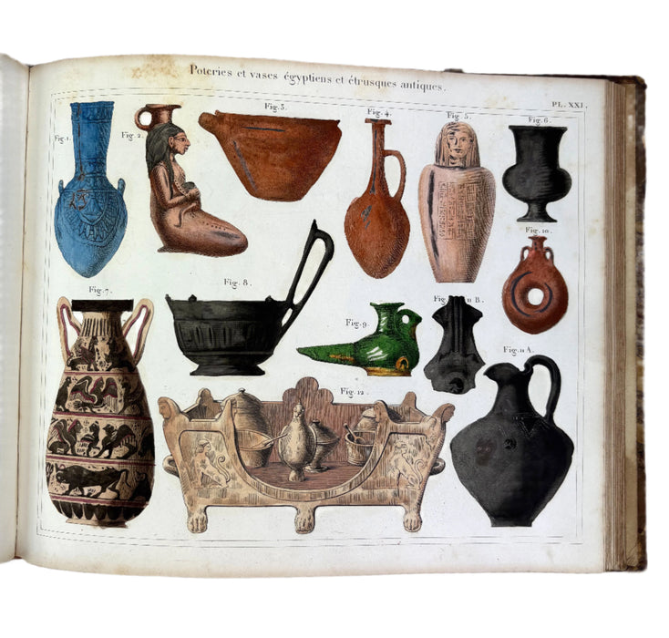 The two text volumes include extensive discussion on the classification, manufacture, and history of pottery across cultures, while the separate atlas volume presents detailed plates—many in colour—depicting ceramic forms, kiln designs, glazes, and decorative patterns. The set reflects both Brongniart’s scientific approach and his appreciation for the artistic and cultural significance of pottery.