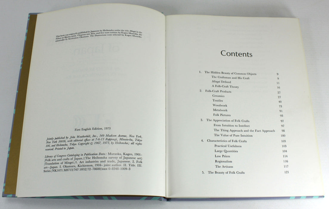 Published by John Weatherhill, inc, New York, and Heibonsha, Tokyo. Originally published in Japanese by Heibonsha under the title Mingei in the Nihon no Bijutsu series. First English Edition 1973. Printed in Japan.